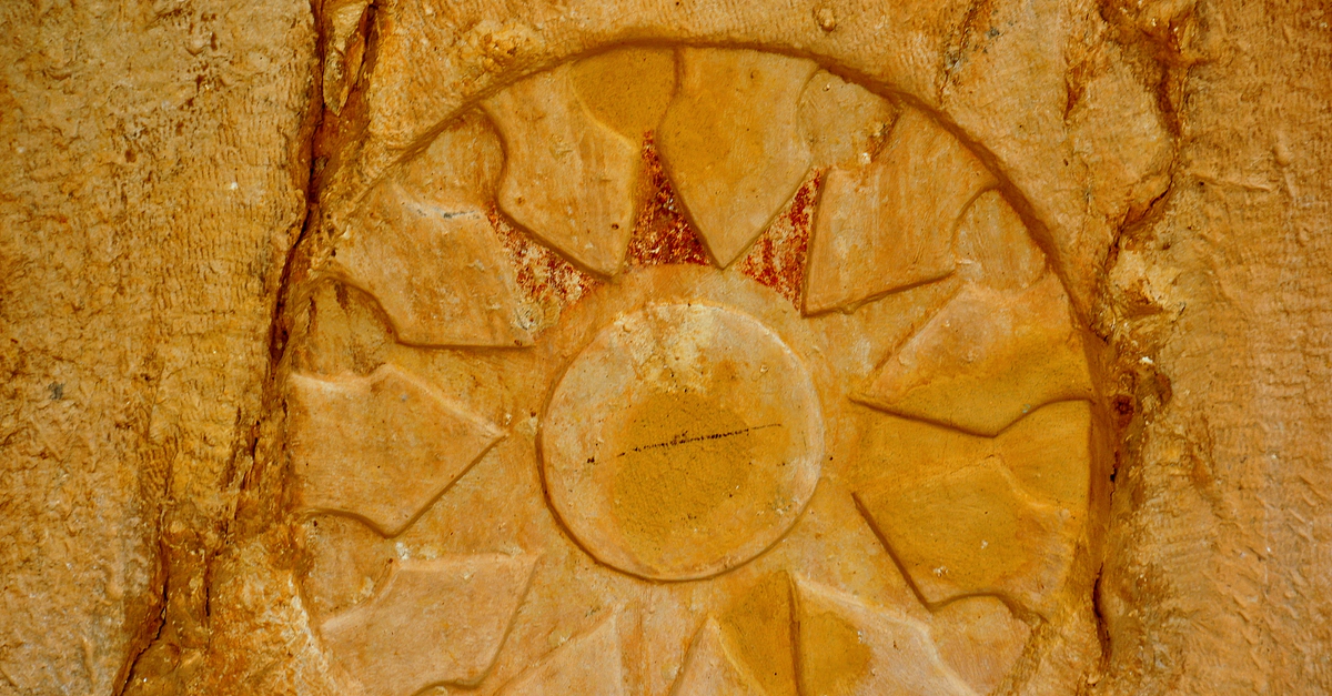 Detail of the relief carved at the façade of the rock-cut tombs of Ashkawt-i Qizqapan (Kurdish: The Cave of the Ravisher or the Cave of the Raped/Abducted Girl). This roundel lies at the right side, above the square entrance into the main burial chamber. It consists of a central boss surrounded by 11 rays, or petals, topped by small half-circles. It is not clear what this image represents; probably it represents the stellar divine emblem of “Ishtar-Anahita”. Note the traces of the original red pigment. Median-Achaemenid Period, 600-330 BCE. Near Zarzi village and the Palaeolithic cave of Zarzi, Chemi Rezan Valley, Sulaymaniyah Governorate, Iraqi Kurdistan.
