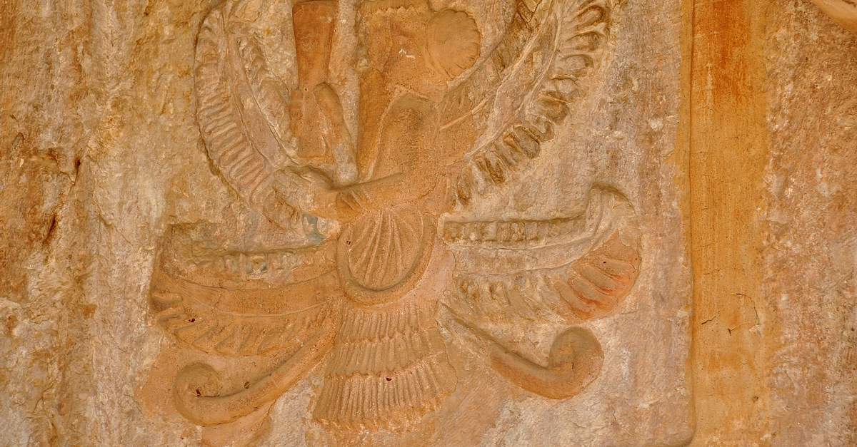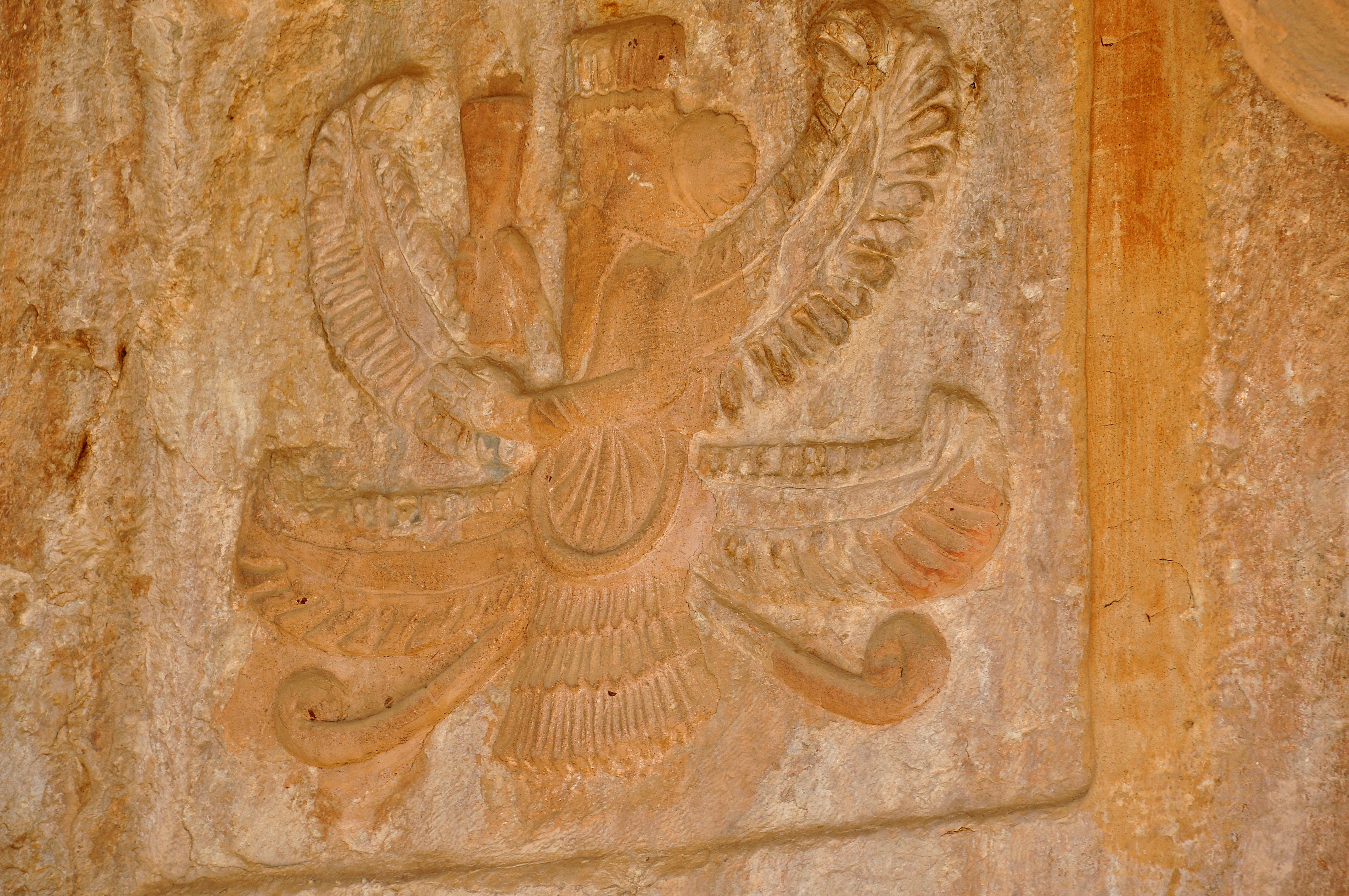 Detail of the relief carved at the façade of the rock-cut tombs of Ashkawt-i Qizqapan (Kurdish: The Cave of the Ravisher or the Cave of the Raped/Abducted Girl). This winged figure lies at the left side above the entrance into the main burial chamber within a rough square. The overall depiction is that of “Ahura Mazda” but with some variations or differences. There are two pairs of wings; two wings are straight/horizontal while the other two are curled upwards towards the head. The body of the bearded crowned figure was reduced (the upper body, from the lower mid-chest appears). In addition, he holds a barsom (a ritual object) in his right hand while the left hand is raised in reverence or salutation. The tail and the ribands underwent an extensive restoration, as they were very much weathered. Median-Achaemenid Period, 600-330 BCE. Near Zarzi village and the Palaeolithic cave of Zarzi, Chemi Rezan Valley, Sulaymaniyah Governorate, Iraqi Kurdistan.