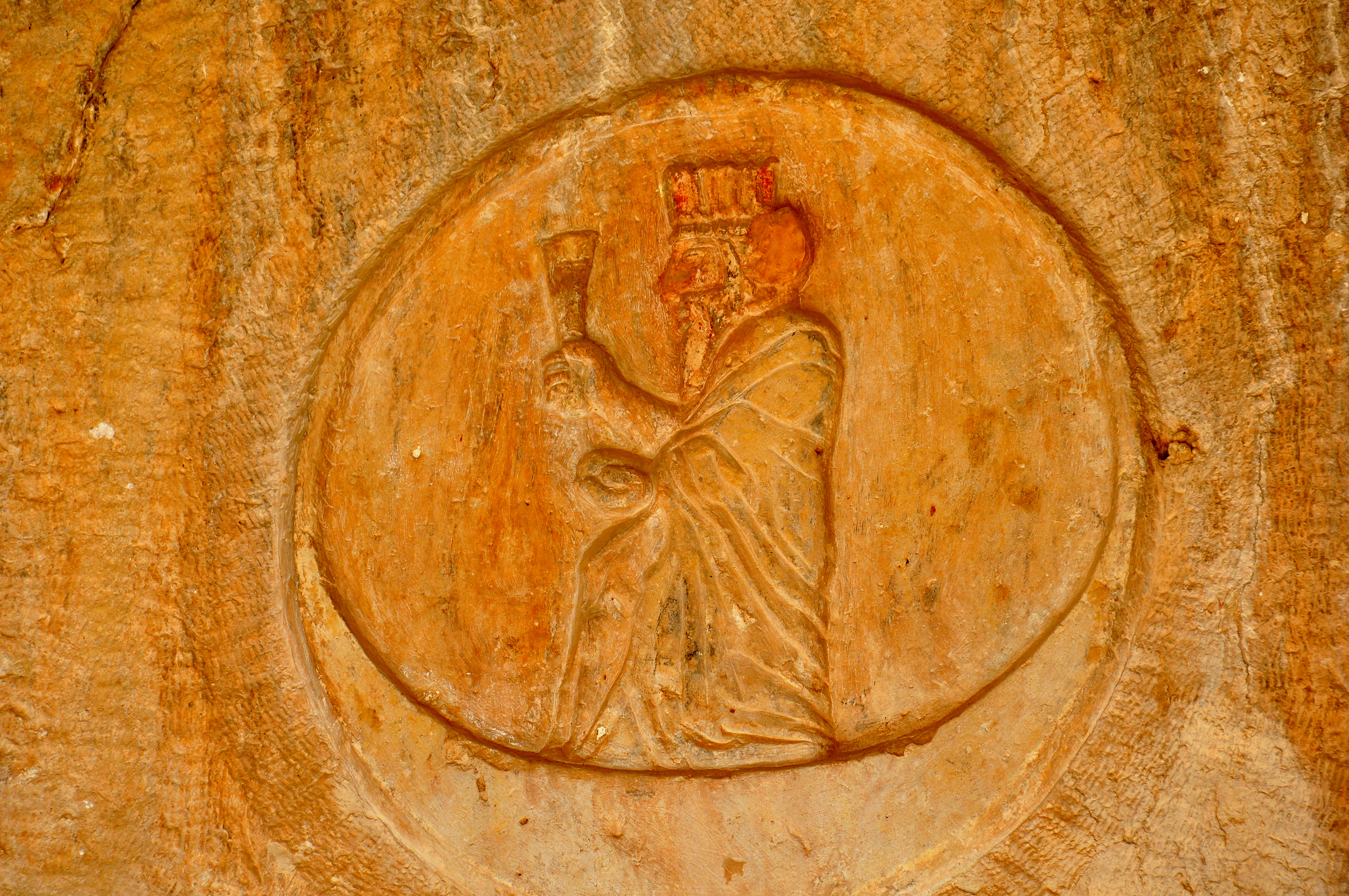 Detail of the relief carved at the façade of the rock-cut tombs of Ashkawt-i Qizqapan (Kurdish: The Cave of the Ravisher or the Cave of the Raped/Abducted Girl). This roundel, of a god emblem, lies above the entrance into the main burial chamber and above the main relief of the standing men and altar. A bearded crowned man sits within a circle; the lower part of the circle is thickened and resembles a lunar crescent. He wears a long robe. The divine figure holds a barsom (a ritual object) with his right hand and the left palm faces upwards and a holds an oval object (it is not clear what this object is). He stands on or rises up from the lunar crescent. Median-Achaemenid Period, 600-550 BCE. Near Zarzi village and the Palaeolithic cave of Zarzi, Chemi Rezan Valley, Sulaymaniyah Governorate, Iraqi Kurdistan.