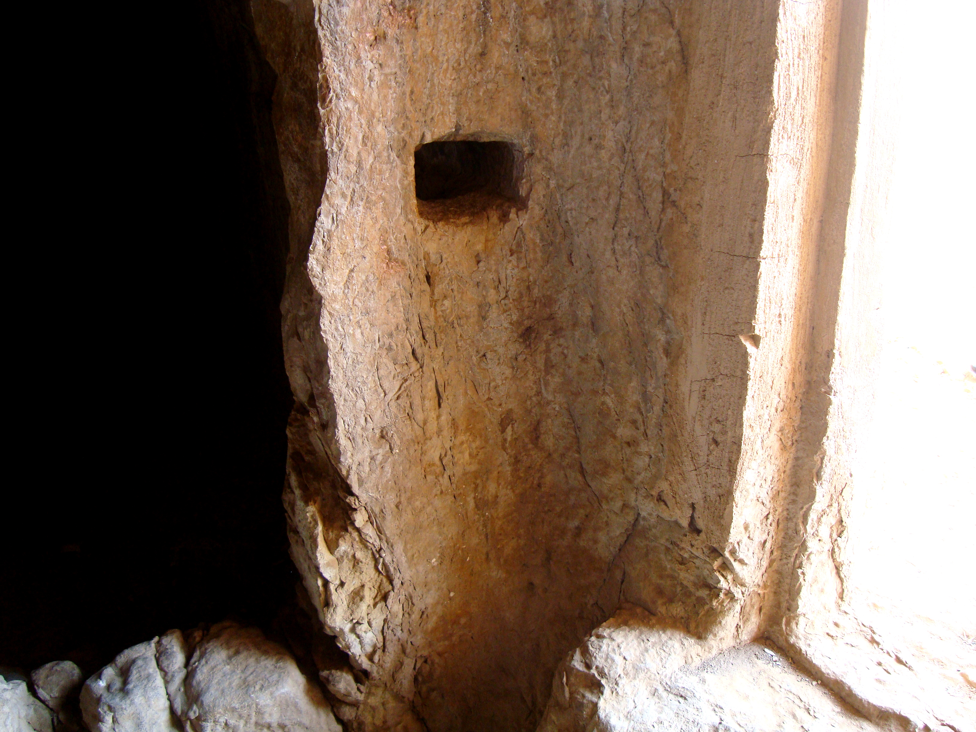 The doorway and entrance to the rock-cut tombs of Ashkawt-i Qizqapan (Kurdish: The Cave of the Ravisher or the Cave of the Raped/Abducted Girl) lead to a central burial chamber. The latter, through a similar square doorway (left), leads to another burial chamber and coffin. The small rectangular hole within the wall of the right burial chamber appears to be part of the doorway opening/closure system. Median-Achaemenid Period, 600-330 BCE. Near Zarzi village and the Palaeolithic cave of Zarzi, Chemi Rezan Valley, Sulaymaniyah Governorate, Iraqi Kurdistan.