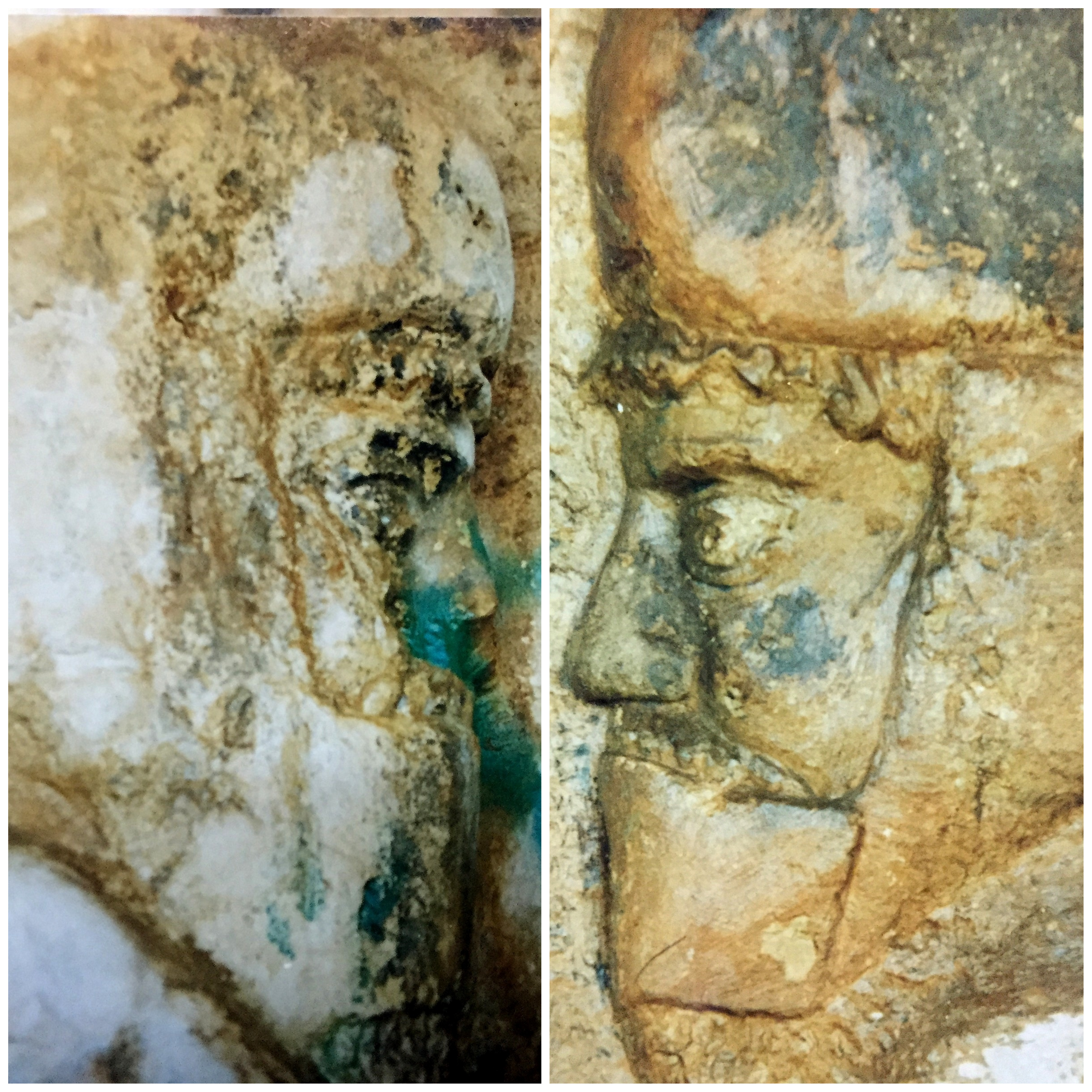 A close-up image of the two standing men of the relief at the façade of the rock-cut tombs of Ashkawt-i Qizqapan (Kurdish: The Cave of the Ravisher or the Cave of the Raped/Abducted Girl). The Median headdress (bashlyk) and the piece covering the mouth are obvious. Note the modern blue spray paint (vandalism). Median-Achaemenid Period, 600-330 BCE. Near Zarzi village and the Palaeolithic cave of Zarzi, Chemi Rezan Valley, Sulaymaniyah Governorate, Iraqi Kurdistan. These photos were shot just before the restoration/conservation work, which was carried out by the Directorate General of Antiquities of Sulaymaniyah in late 2002; the right photo was shot on October 24, 2002, while the left photo was shot on October 27, 2002. Photos courtesy Hashim Hama Abdullah, director of the Sulaymaniyah Museum.