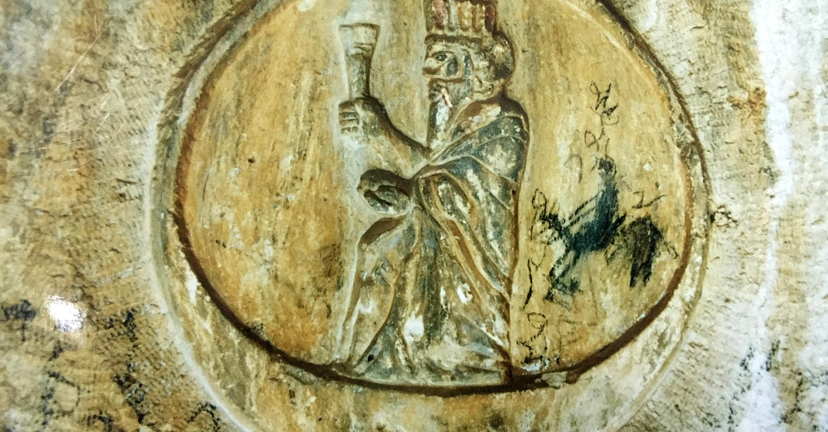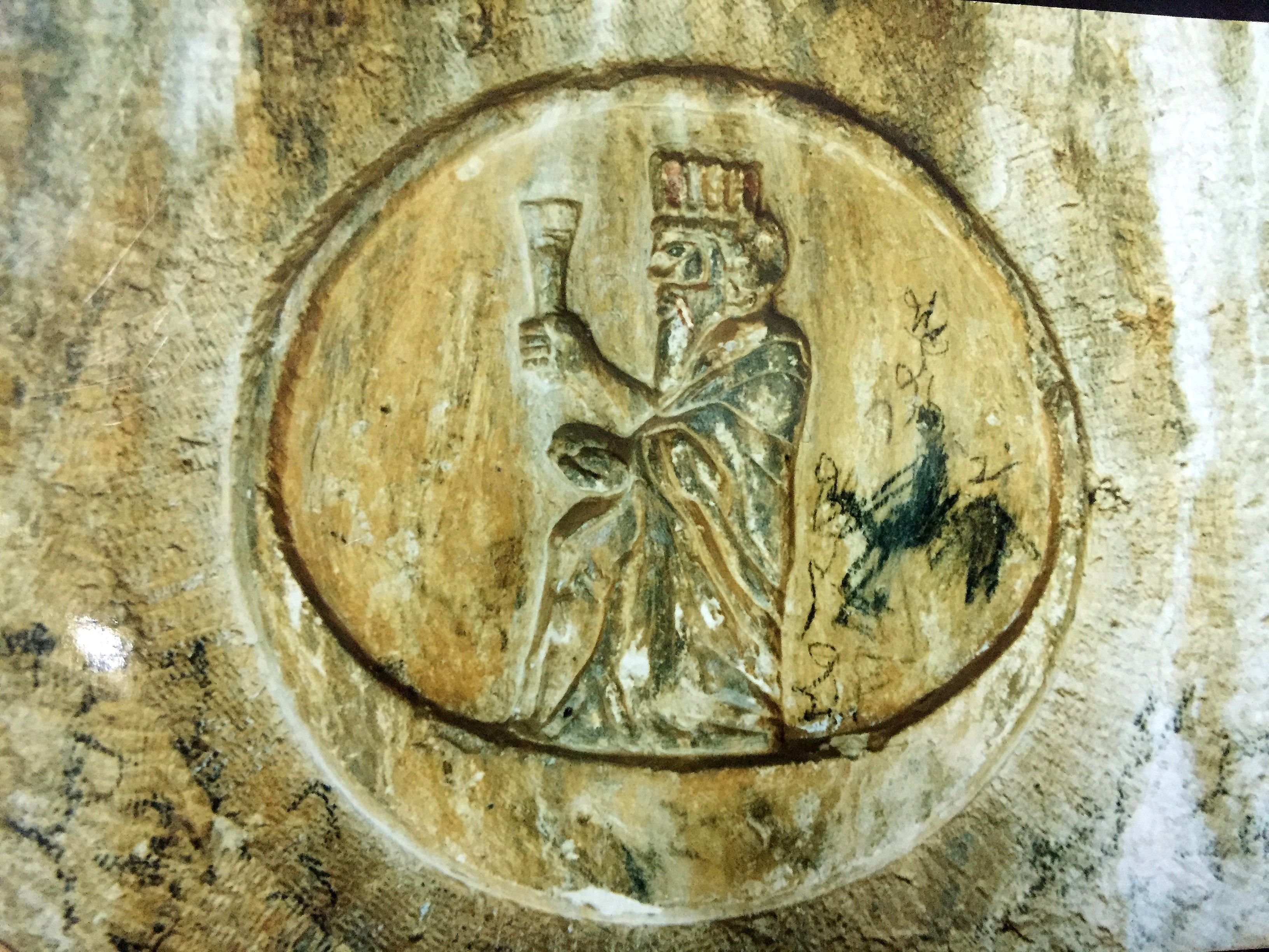 A close-up image of the central roundel of the divine emblem at the façade of the rock-cut tombs of Ashkawt-i Qizqapan (Kurdish: The Cave of the Ravisher or the Cave of the Raped/Abducted Girl). This image was shot just before the restoration/conservation work, which was carried out by the Directorate General of Antiquities of Sulaymaniyah in late 2002. The date of the image is October 24, 2002. Note the modern writings and the modern sketch of a human figure riding on a horseback (vandalism) as well the traces of the original red colour on the crown and the dark green robe. Median-Achaemenid Period, 600-330 BCE. Near Zarzi village and the Palaeolithic cave of Zarzi, Chemi Rezan Valley, Sulaymaniyah Governorate, Iraqi Kurdistan. Photo courtesy Hashim Hama Abdullah, director of the Sulaymaniyah Museum.