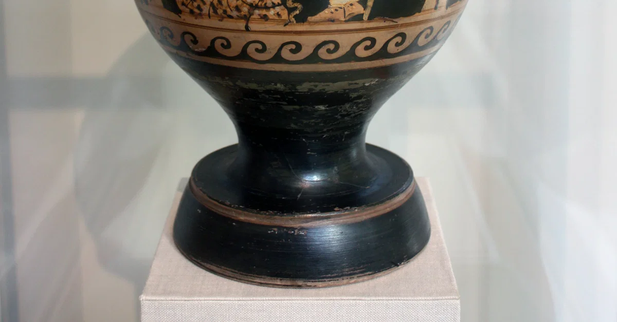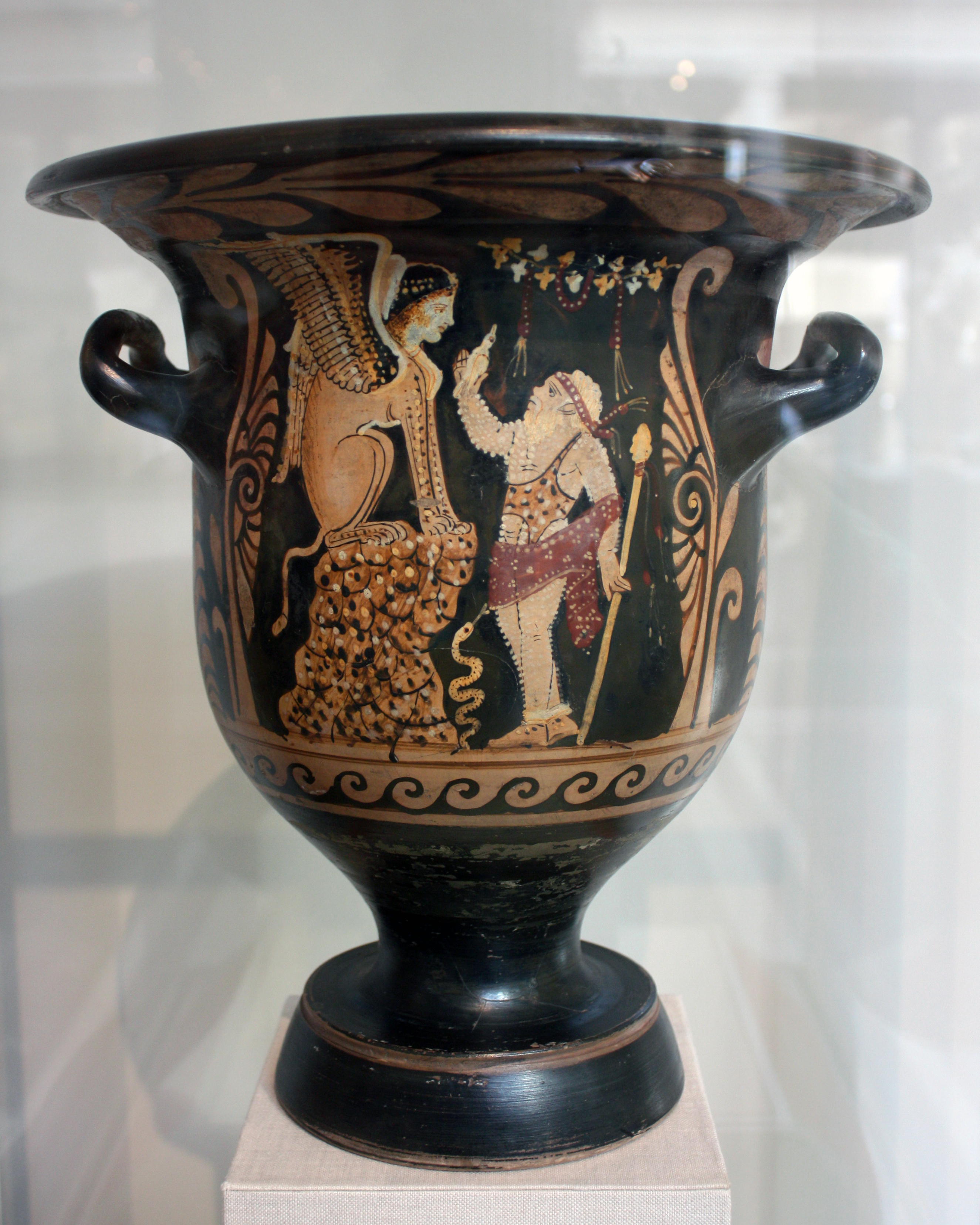 Bell-Krater (mixing bowl) depicting the Theban Sphinx and Oedipus in the guise of a satyr. Greek, South Italian, Paestan, red-figure, 3rd quarter of the 4th century BCE. Attributed to Python. (Metropolitan Museum of Art, New York)