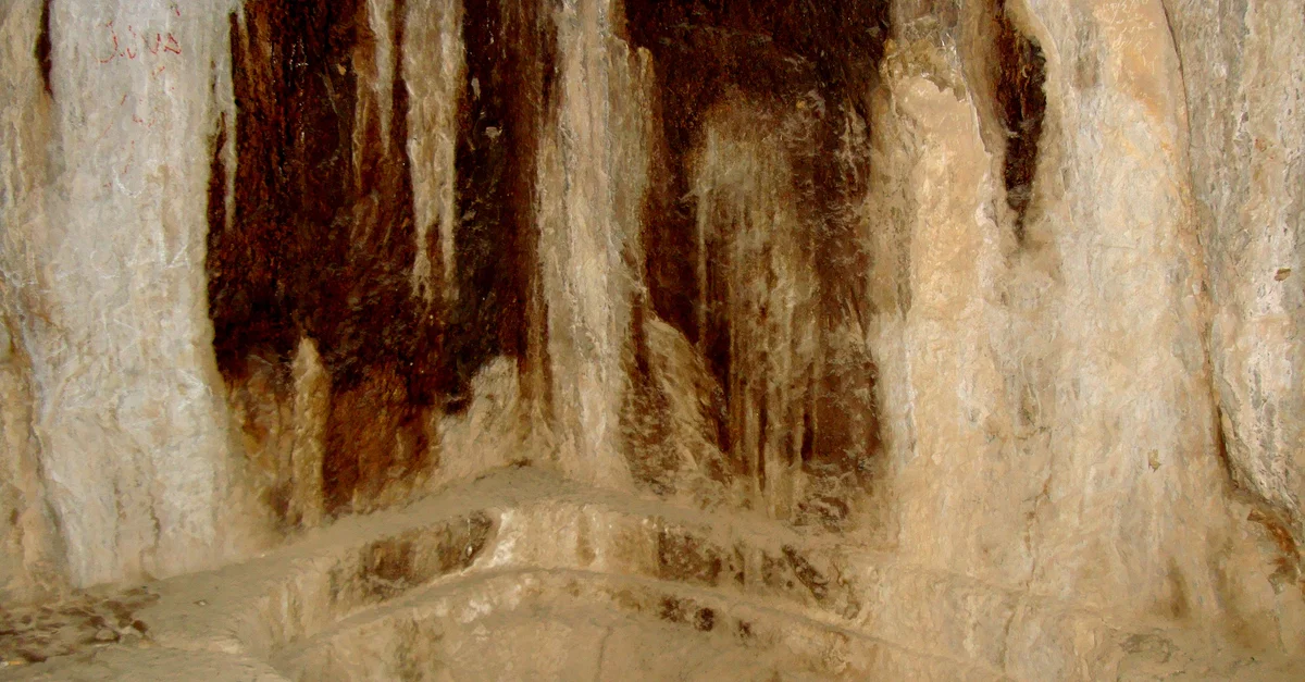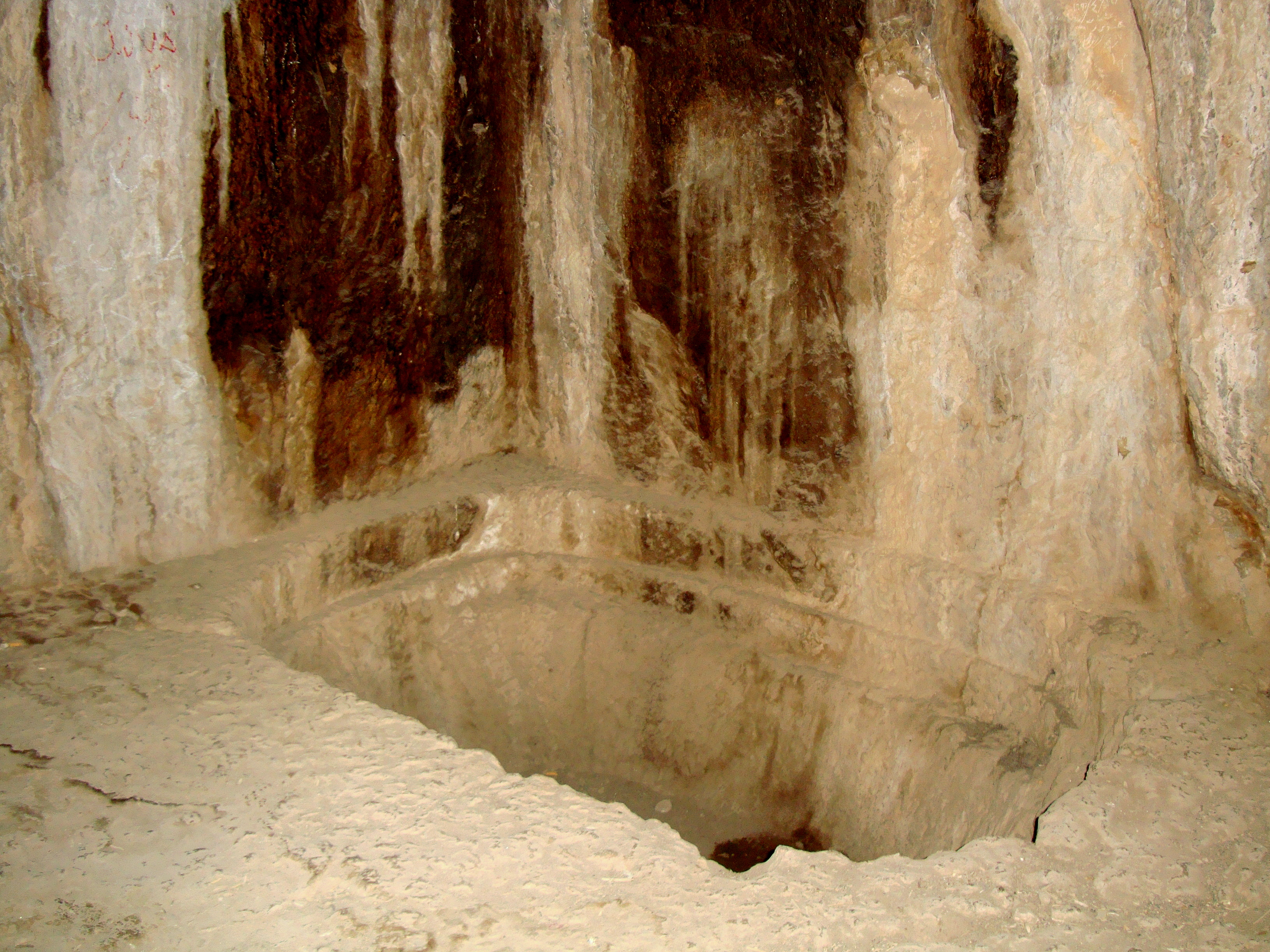 This is the right burial chamber at the rock-cut tombs of Ashkawt-i Qizqapan (Kurdish: The Cave of the Ravisher or the Cave of the Raped/Abducted Girl). This rectangular coffin was carved into the rocky floor, which was hollowed out. Probably the coffin was covered by a stone lid at the upper rim. The length of the coffin is short for an outstretched adult body; therefore, this type of coffin appears to be an “astodana”. The central burial chamber leads to this right-sided chamber through a square doorway. Median-Achaemenid Period, 600-330 BCE. Near Zarzi village and the Palaeolithic cave of Zarzi, Chemi Rezan Valley, Sulaymaniyah Governorate, Iraqi Kurdistan.