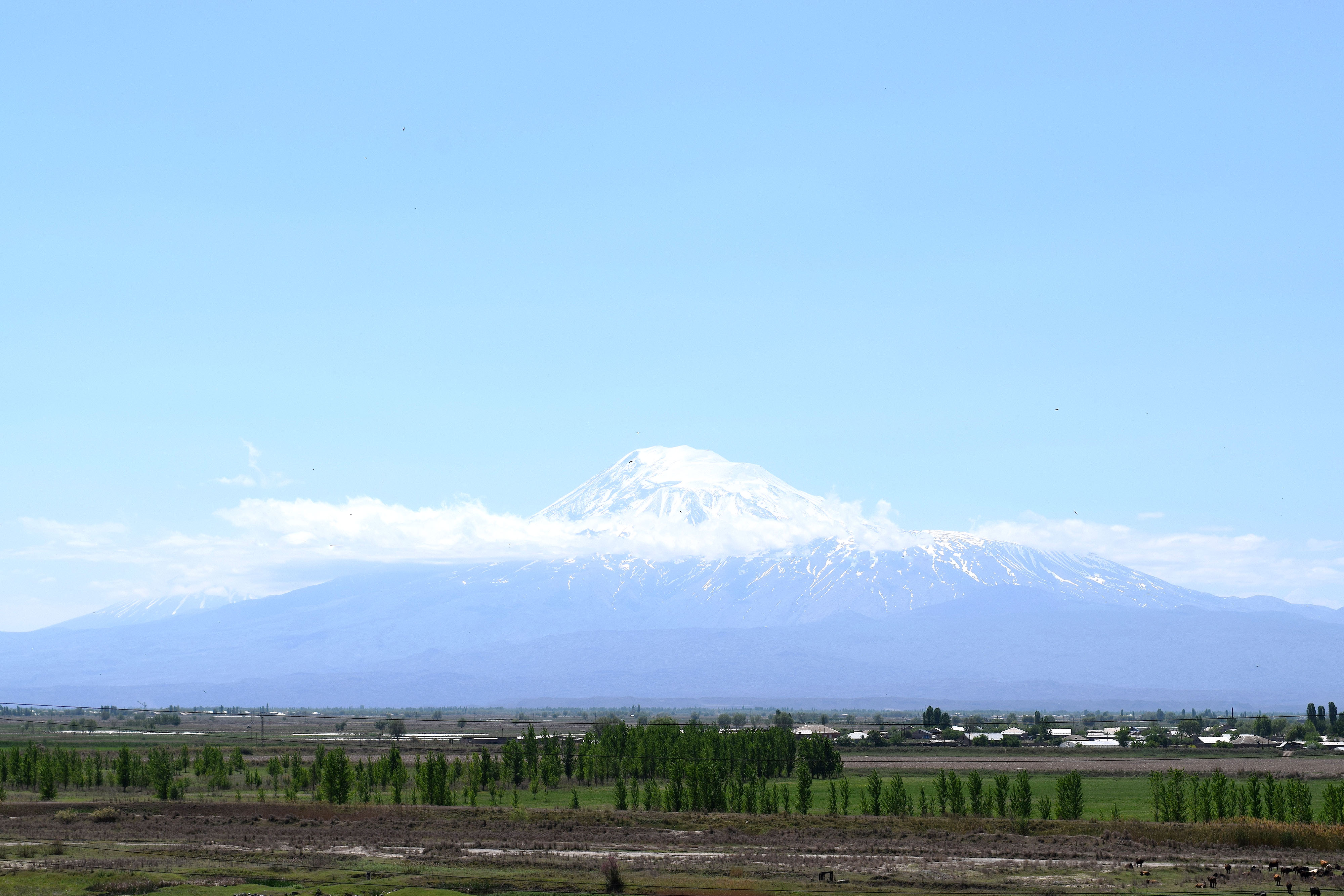 Mount Ararat (Armenian: Masis; Turkish: Ağrı Dağı; Kurdish: Çiyaye Agiri) is a dormant, compound volcanic mountain, consisting of two ancient volcanic peaks, located in present-day eastern Turkey very close to the border with Armenia. Strongly associated with Armenian culture, mythology, and identity, Mt. Ararat is also where, according to some legends, Noah’s Ark landed after the biblical flood. This view is from Metsamor, Armenia. Little Ararat is obscured by clouds on the left-hand side of the photograph.