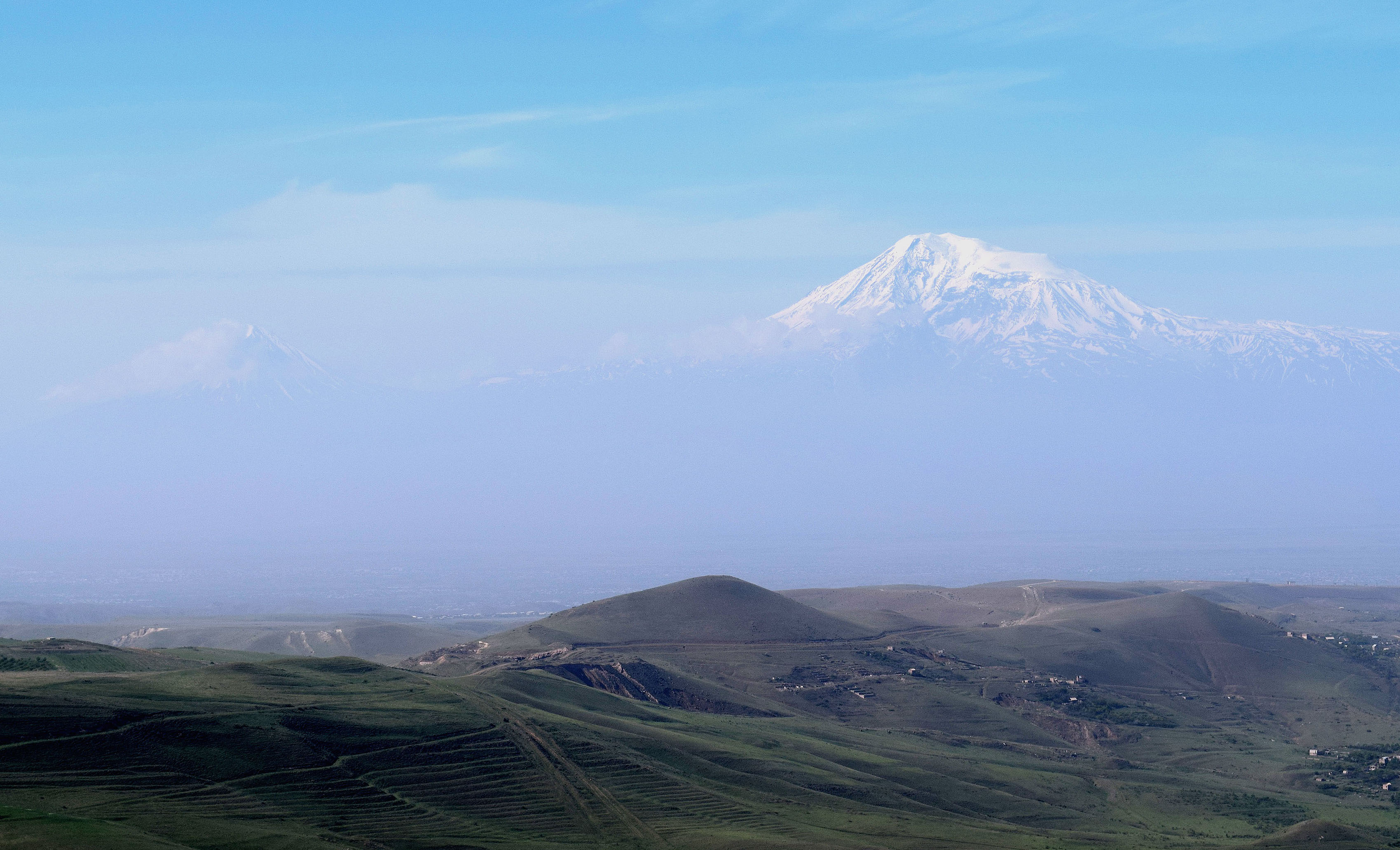 Together, the Ararat Mountains straddle the borders of what are present-day Turkey, Armenia, Iran, and Azerbaijan. Mt. Ararat (“Greater Ararat”) rises to a height of 5,137 m (16,854 ft). Mt. Ararat’s neighboring mountain, Little Ararat (“Ararat the Lesser”), on the left of this photograph, rises upwards to 3,925 m (12,877 ft). This photograph was taken just outside of Yerevan, Armenia.