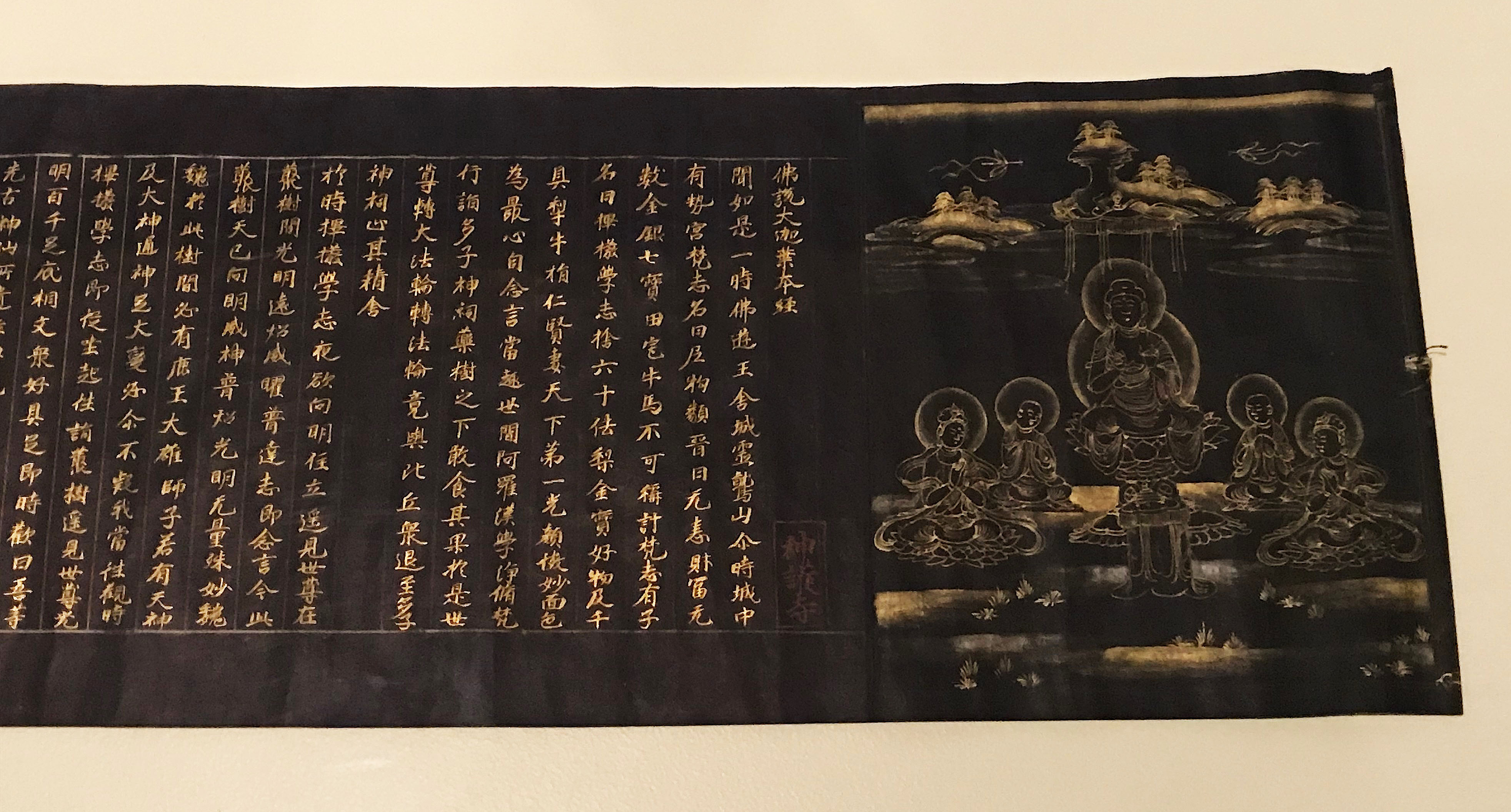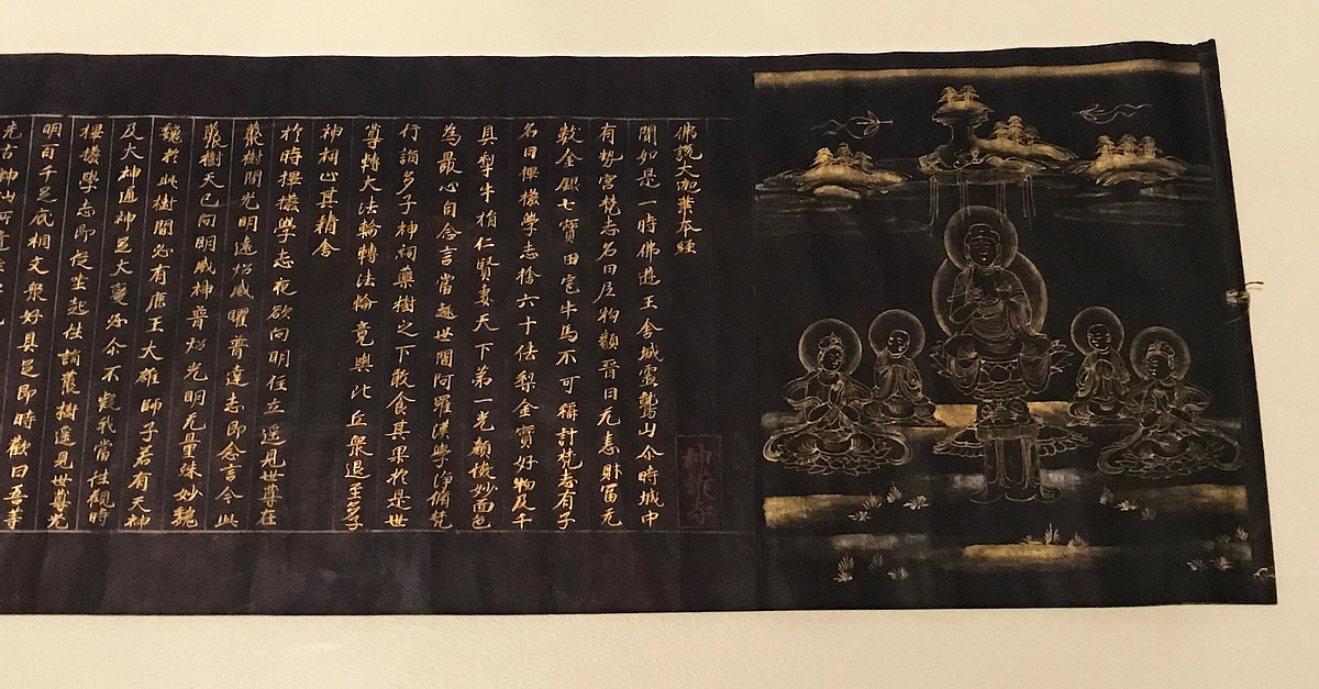This illuminated sutra is from Jingoji Temple in Kyoto, Japan, and it dates to 1179 CE, which corresponds to Japan's Heian period. It is made of gold and silver on indigo paper. (Iris & B. Gerald Cantor Center for Visual Arts at Stanford University, Stanford, California)