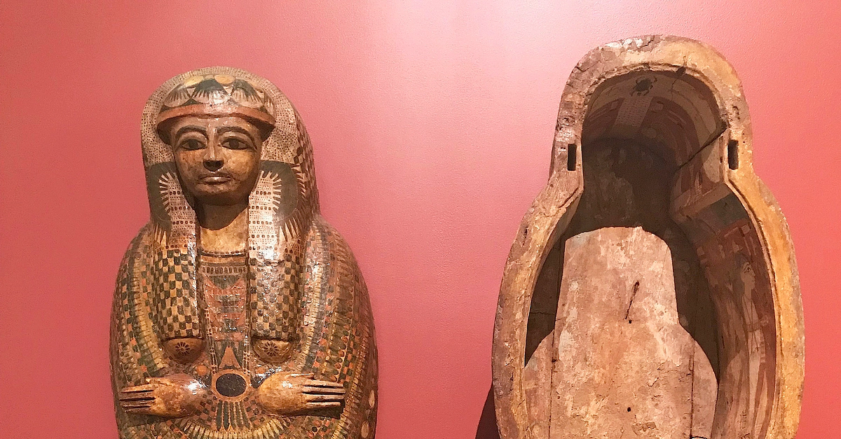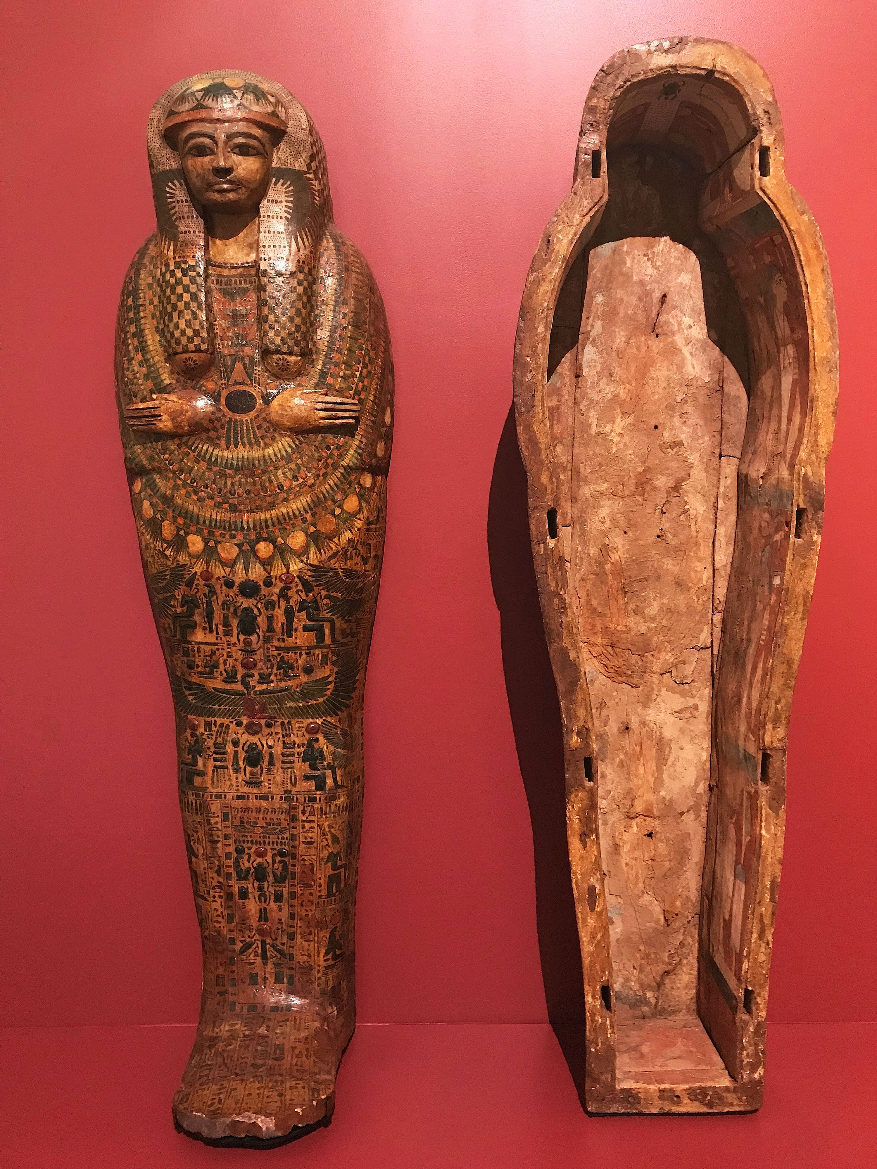 This is the coffin of the "Chantress of Amun," and it dates c. 1070-945 BCE or Egypt's Third Intermediate Period (c. 1070-712 BCE). It is made of wood with a painted gesso relief. Ancient Egyptian coffins sheltered remains and provided a home for the deceased's life force, the "ka," as well as the individual's personality, or "ba." The ka and ba rejoined each day at dawn, when the sun rose and Osiris, the god of the afterlife, was resurrected. The coffin's interior is adorned with protective spells and figures referencing the gods to ensure safe passage into the afterlife. (Iris & B. Gerald Cantor Center for Visual Arts at Stanford University, Stanford, California)