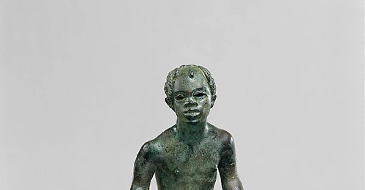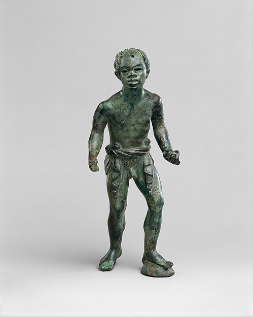 This Hellenistic bronze statuette of an African youth dates to sometime between the 2nd-3rd Centuries BCE. It portrays a young worker, likely a blacksmith or other artisan, of Sub-Saharan African origin. While the piece is of unknown provenance, it can currently be seen in the collection of the Metropolitan Museum of Art, New York.
