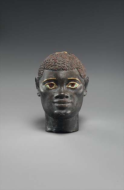 This beautifully crafted head portrays an "Aethiopian", or black African, and is made out of black bronze, gold, obsidian and carnelian. The piece was once a part of an ornate object like a serving dish although it has been broken off at some point between Antiquity and today. Crafted in Hellenistic style, the piece comes from Ptolemaic Egypt and dates to roughly 332-30 BCE. It is now a part of the collection of the Metropolitan Museum of Art, New York.