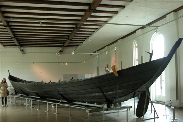 The first Viking ship able to navigate the sea easily is known as the Nydam ship, from Denmark, built c. 350-400 CE, though this ship had no sail. Gottorp Castle, Sleswig.