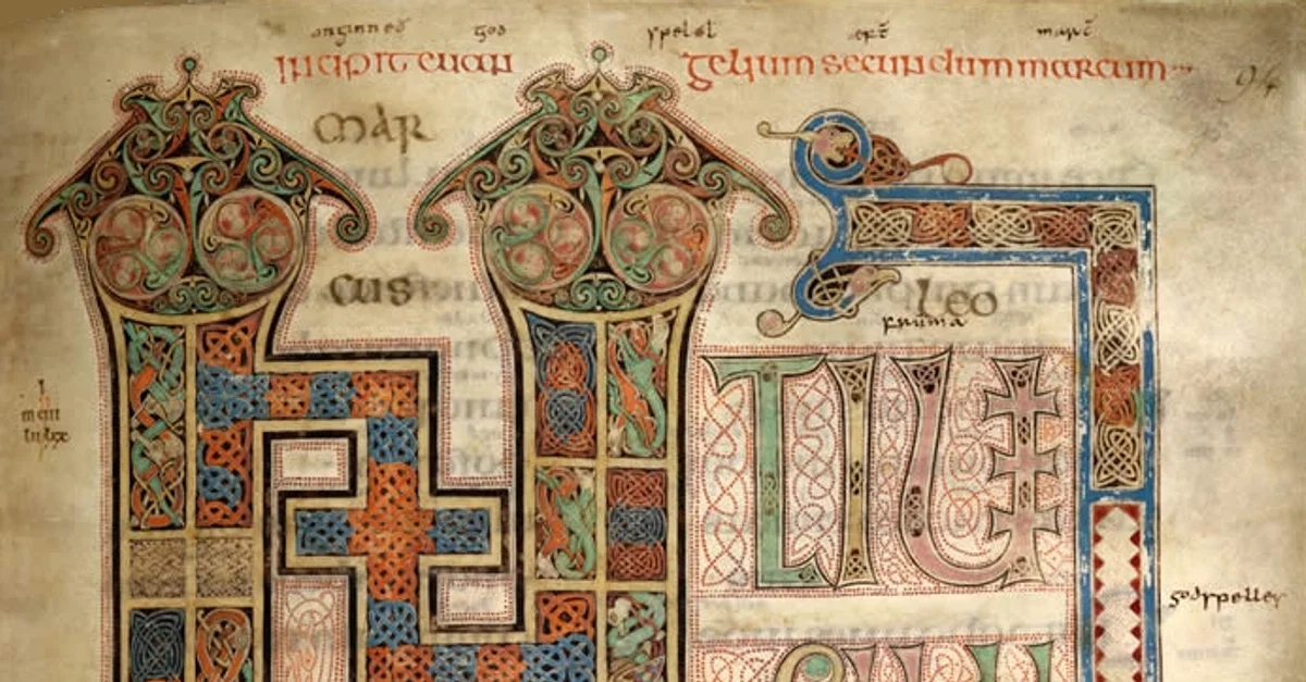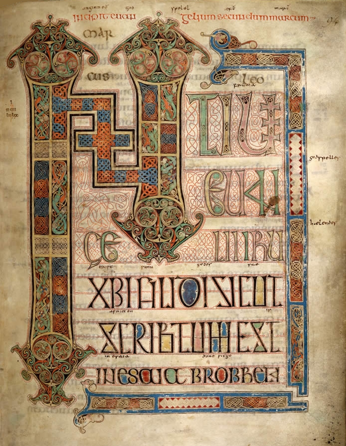 Initial page of the Gospel of St. Mark from the Lindisfarne Gospels (c. 700-715 CE), created at the Lindisfarne Priory on the “Holy Island” off the coast of Northumbria, Britain.