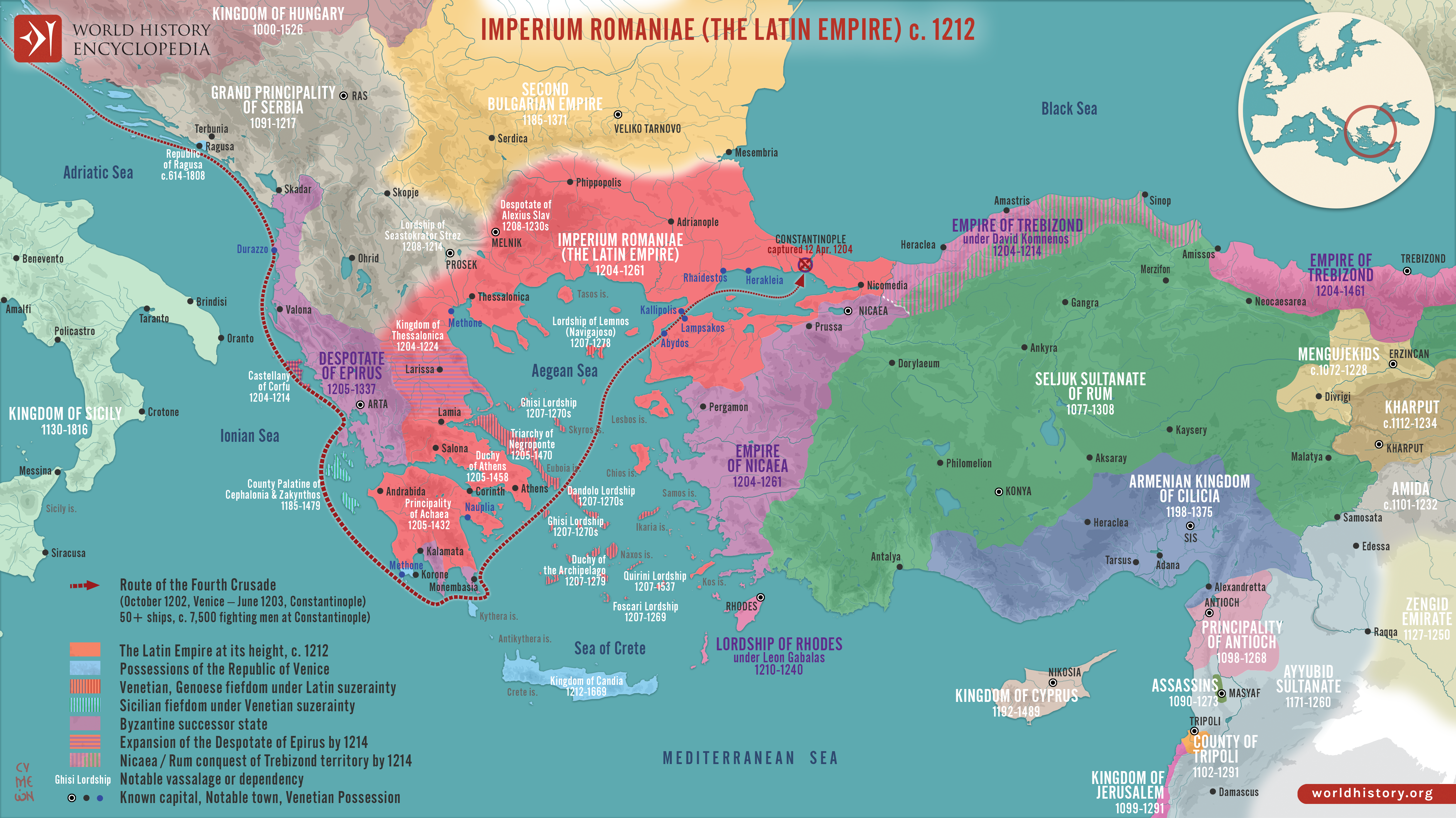 This map illustrates the rise of the Latin Empire (Imperium Romaniae), a Crusader state founded by Western European forces after the Fourth Crusade's sack of Constantinople in 1204. It replaced the Byzantine Empire (Eastern Roman Empire) and was intended to establish Latin Christian dominance in the region. The empire was ruled by Frankish and Venetian elites, with Baldwin I of Flanders crowned its first emperor.