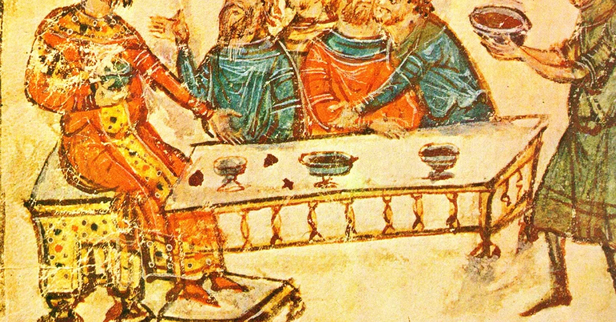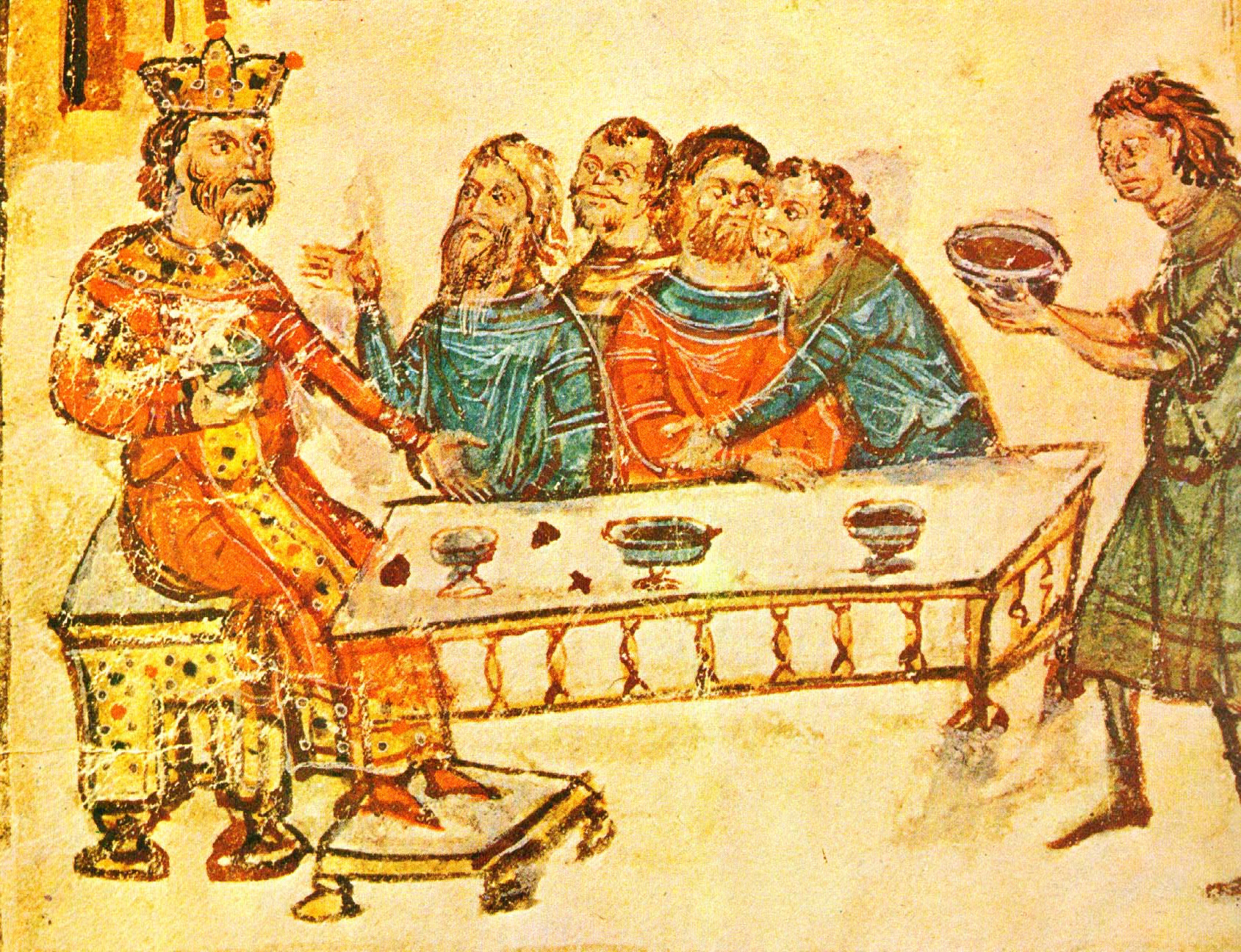 A 15th century CE manuscript illustration depicting the Bulgar Khan Krum (r. c. 802-814 CE) about to receive a drinking cup made from the skull of the Byzantine emperor Nikephoros I (r. 802-811 CE) whose army he had defeated in July 811 CE.
