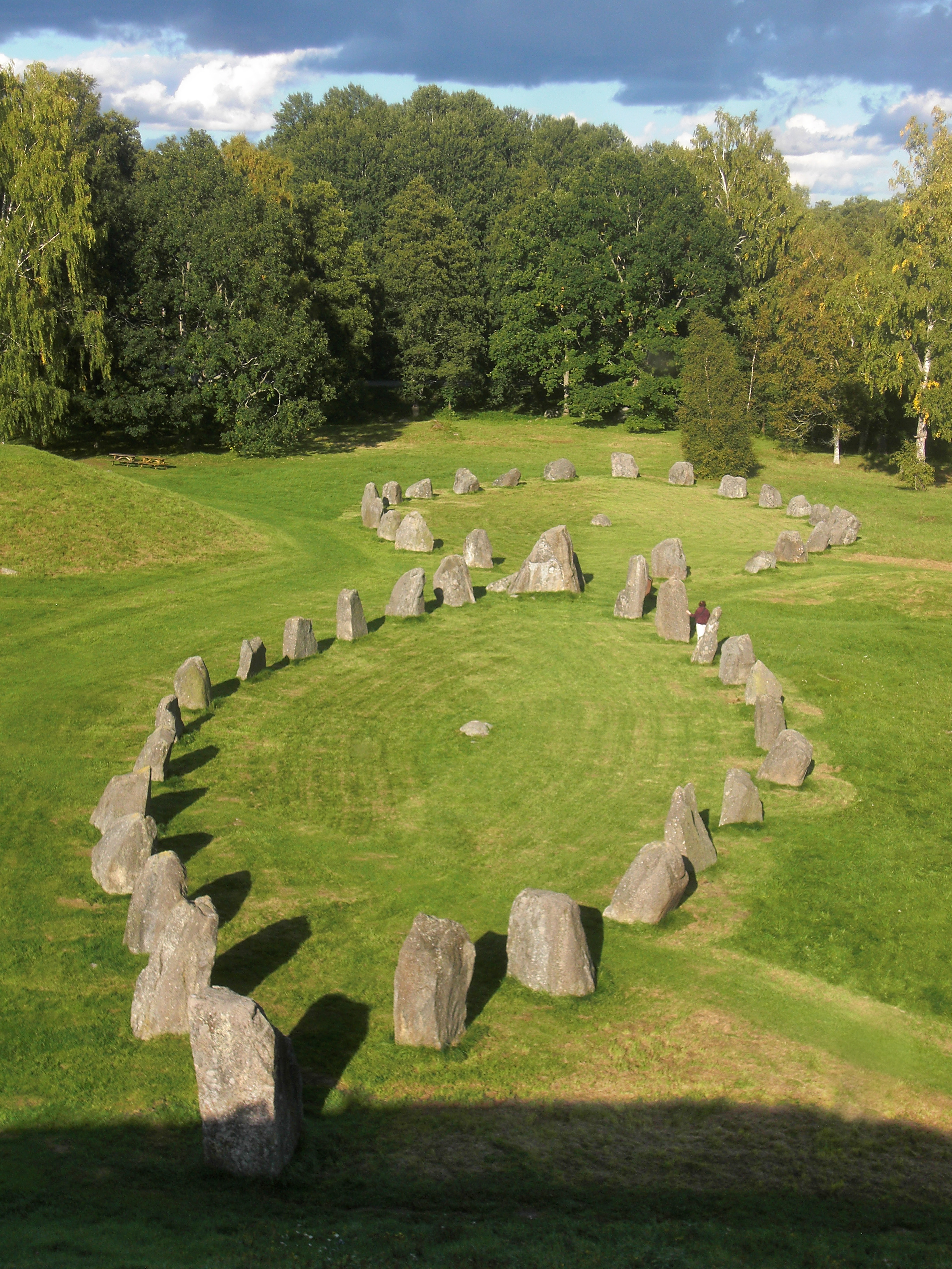 Early Scandinavian burial mound marked by stones laid out in a ship-pattern - a practice that was common in Scandinavia from the Bronze Age through the Viking Age. This particular one is situated in Anundshög, Västerås, Sweden, and dates to some time before the Viking Age (exact date unsure). The mound is 60 meters in diameter and 9 meters high.