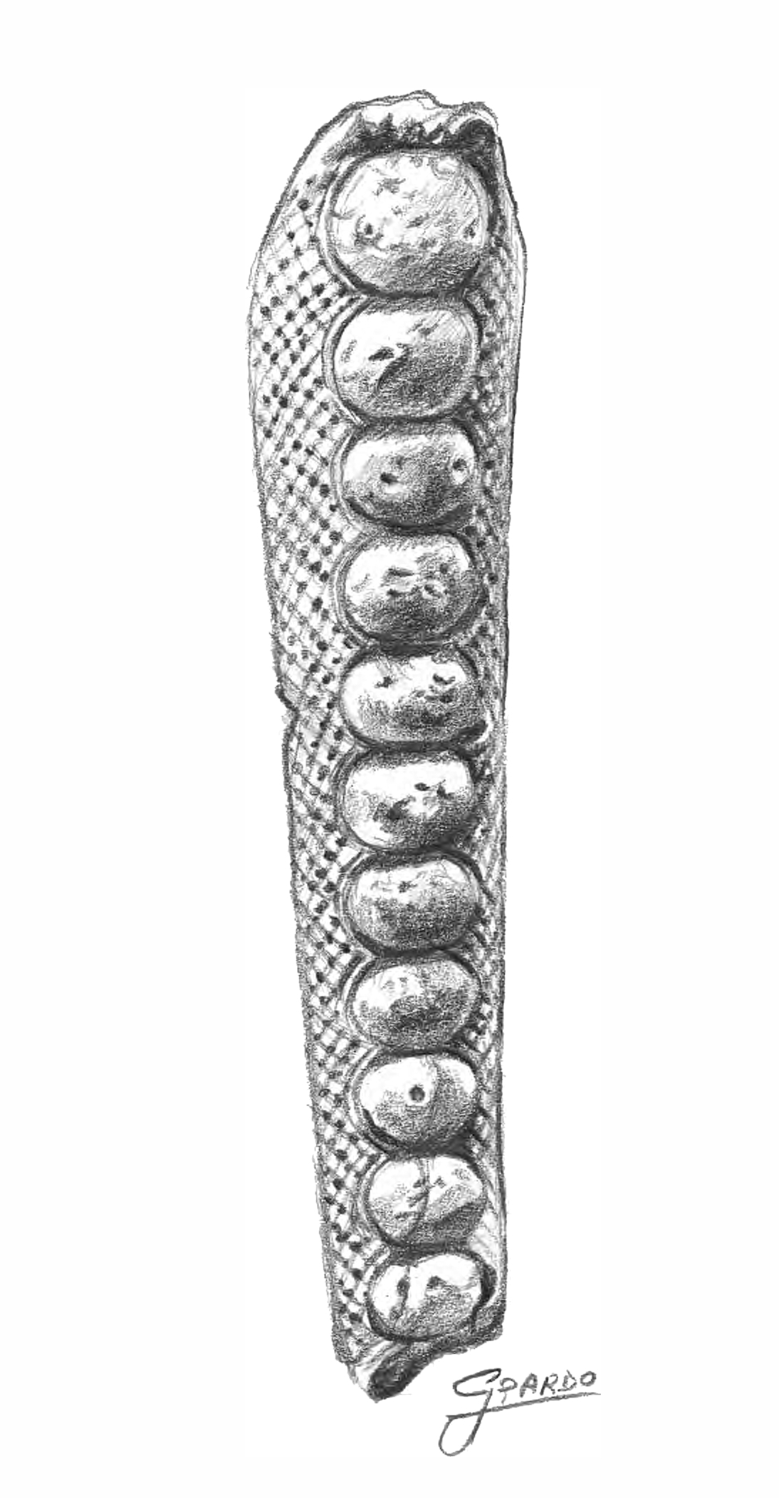 Animal bone segments (early bronze age, c. 2169 - c. 1500 BCE), between 13-15 centimeters in length, sometimes decorated with incisions on which, successively, have been carried out globules in relief. Their uses are not yet known, although some scholars have supposed that these artefacts could be small idols, while others think they could be dagger handles. (Pencil drawing by Gina Pardo).
