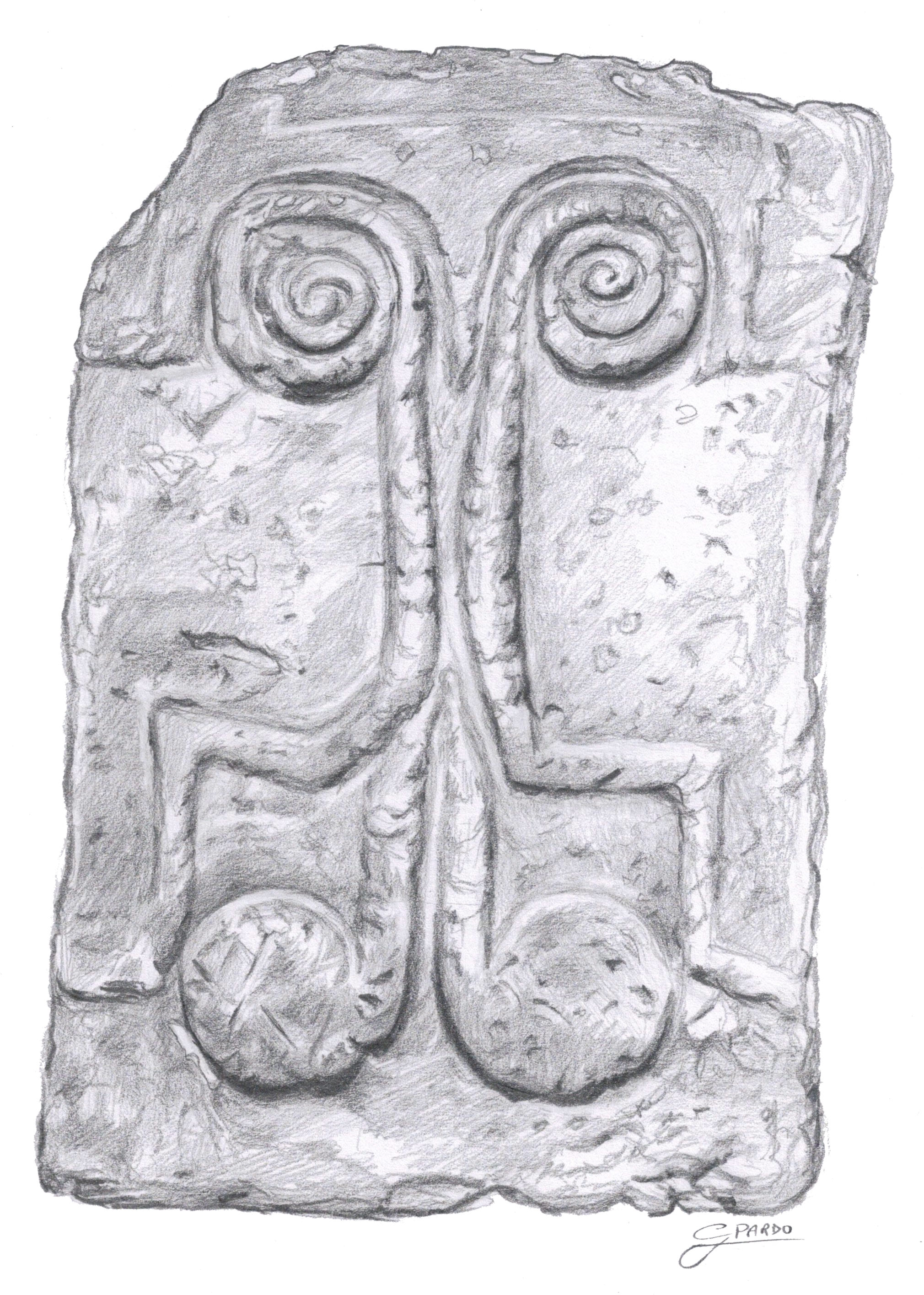 Stone door (early bronze Age, c. 2169 - c. 1500 BCE) closing of a grave dug in the rock, decorated in relief with spiral shaped motifs. On it are carved images that could allude to the sexual act and, therefore, to the continuation of life. Castelluccio Culture, Sicily. (Pencil drawing by Gina Pardo).