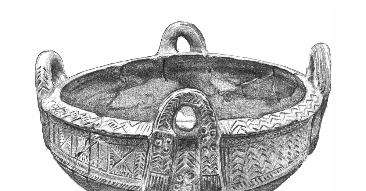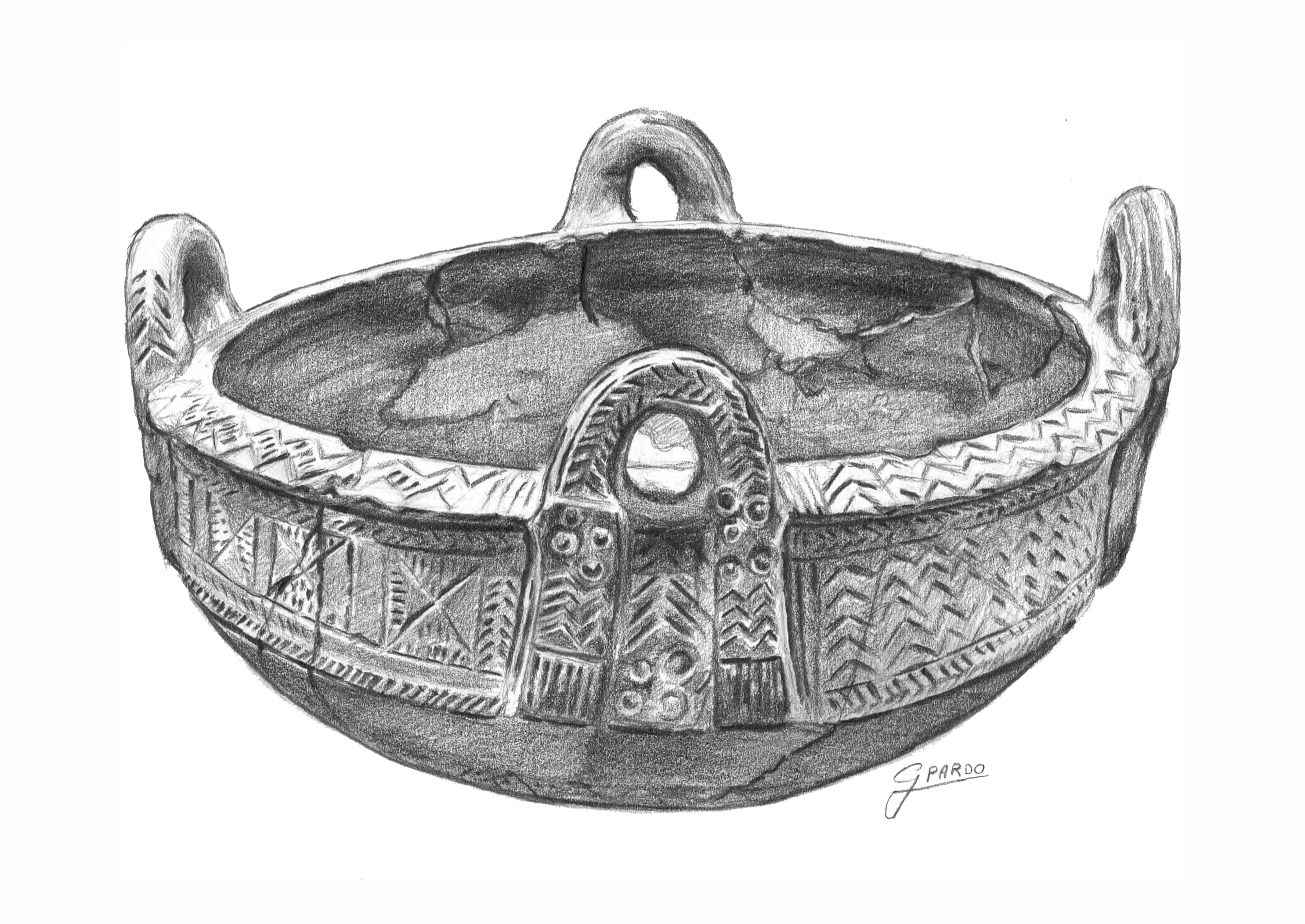 Four handled large bowl from Sicily (late Bronze Age, second half 8th century BCE - second half 7th century BCE) embellished with geometric patterns. The engravings consist of groups of lines, triangles with internal hatches and other inscribed triangles, in which the meander motifs predominate. It is equipped with three or four vertical handles that rise up out of the edge. Probably it is the ceramic version of a metal vase. (Pencil drawing by Gina Pardo).