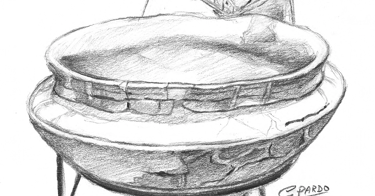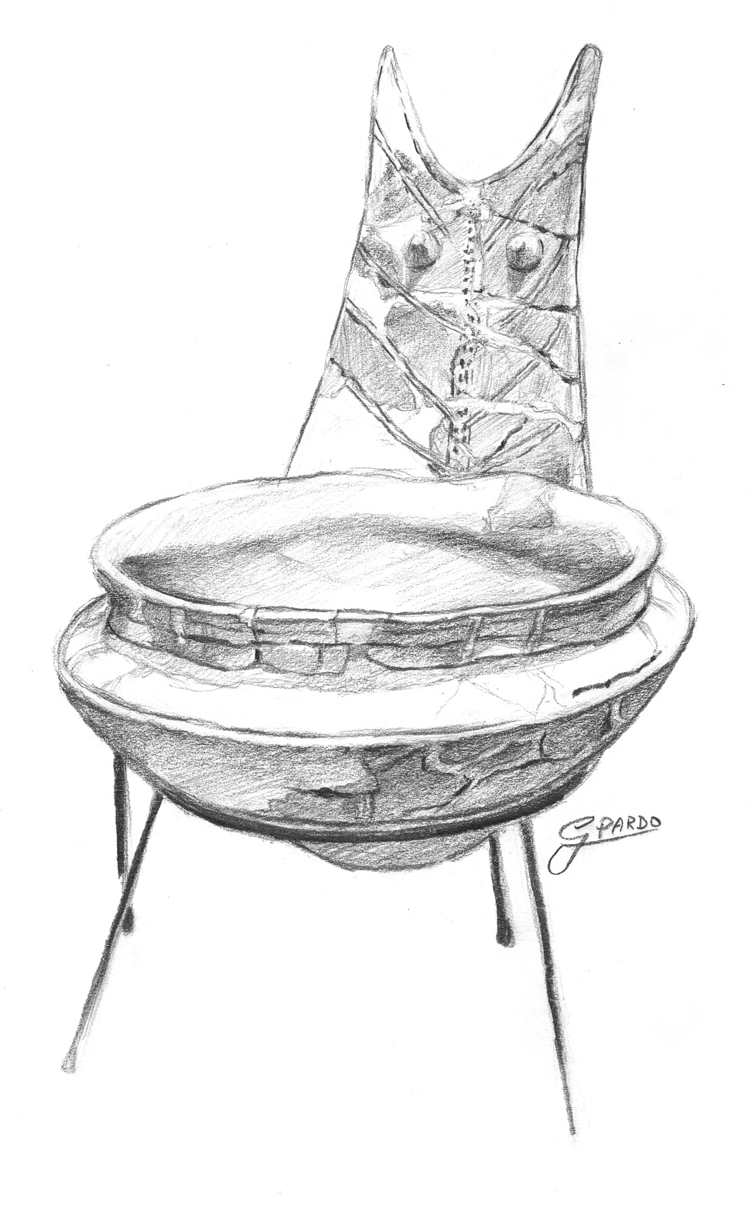 Large wash basin on a high foot with bifid handle (c. 1500-c. 1200 BCE), richly decorated with geometric engravings. Thapsos Culture, Sicily. (Pencil drawing by Gina Pardo).