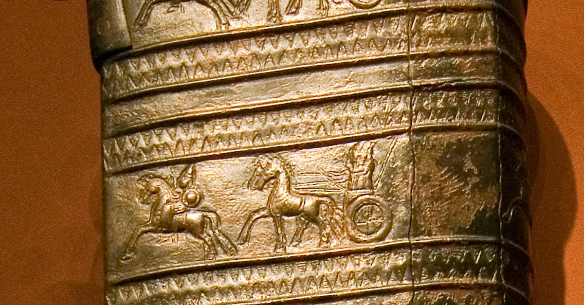 A bronze quiver of the Urartu civilization (9th-6th century BCE) from Teishebaini (Kamir-Blur, Armenia). It is inscribed with the name of King Sarduri II (r. c. 760-743 BCE). (Hermitage Museum, Saint Petersburg)