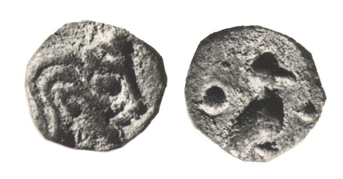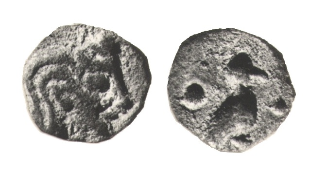 Silver. Weight: 0,150 gr., 0,111 gr., 0,110 gr. Obverse: Archaic female head to the right (identical with archaic female head depicted on the II type hemidrachm). Reverse: Bird (crane) to the right. Mint: Phasis. Nominal: Attic system hemitetartemorion Date: 5th c. BCE