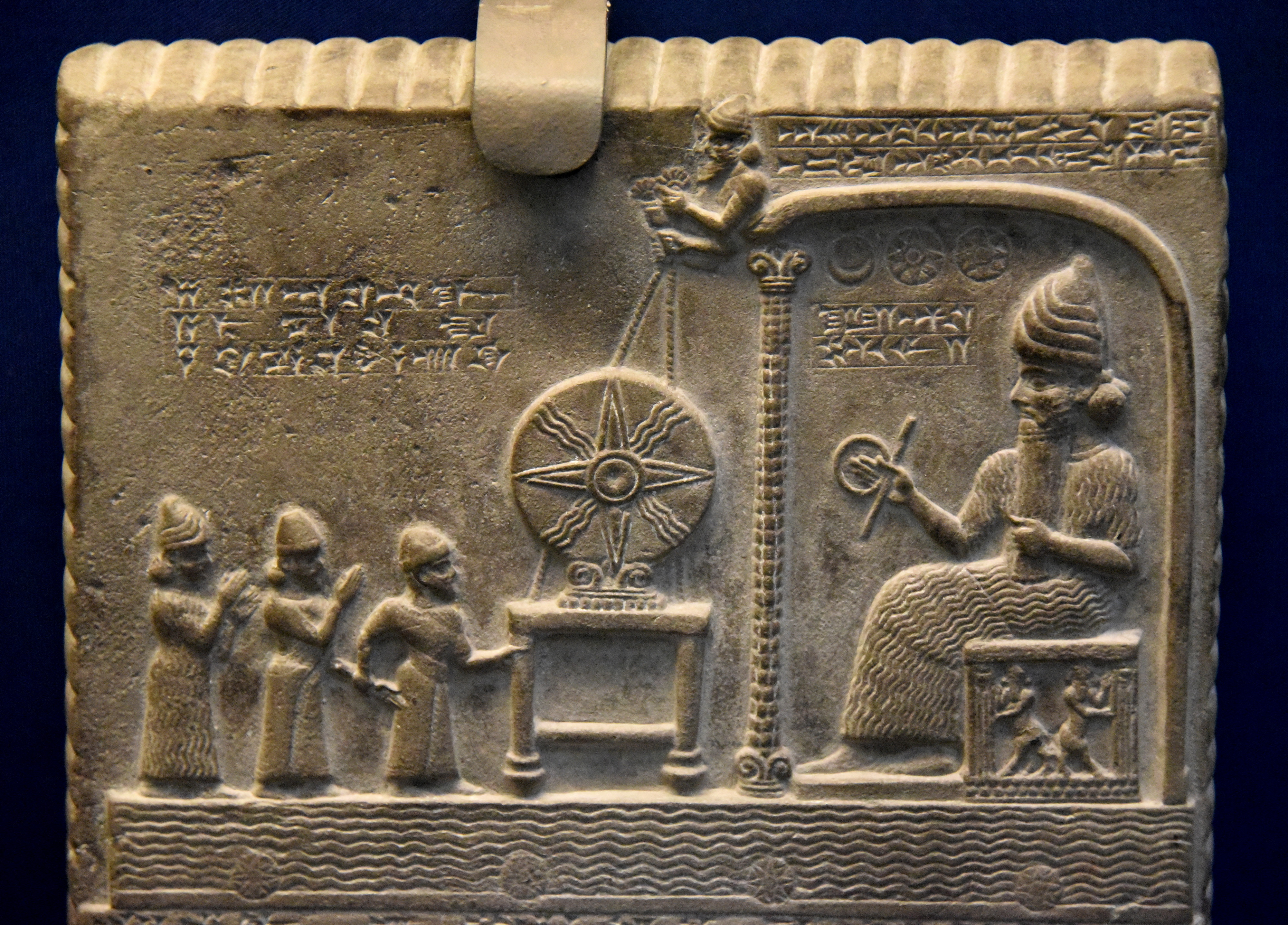 This is the upper part of the obverse side of the tablet, which was excavated by Hormuzd Rassam in the late 19th century CE. Nabu-nadin-shum (a priest) and the goddess Aa lead Nabu-aplu-iddina (a king of Babylon, reigned 888 – 855 BCE) to a shrine. Within the shrine (Ebabbara), the Sun God, wearing a horned headdress, sits on a stool and holds a ringed rod in his right hand. Before him, a solar disc rests on an altar, which is supported by ropes held by attendant deities (which can be seen on the roof of the shrine). The whole shrine sits on what appears to be a heavenly ocean. Above the Sun god, symbols of Sin, Shamash, and Ishtar appear. The text (on the obverse and reverse sides of the tablet), which is not shown here, records Nabu-apla-iddina's re-endowment of the Sun-Temple at Sippar. Another additional text was added to the tablet later during the reign of the Neo-Babylonian king Nabopolassar (626-605 BCE). Middle Babylonian Period, 860-850 BCE. From Sippar, Southern Mesopotamia modern-day Iraq. (The British Museum, London).
