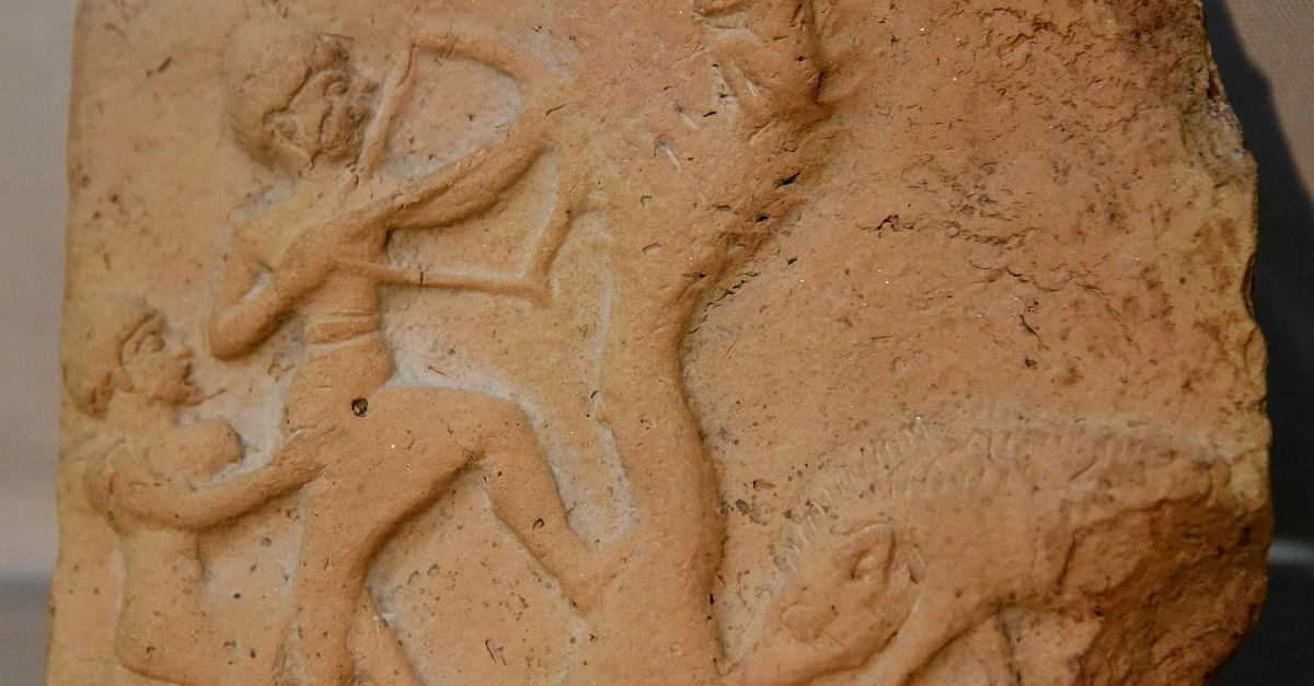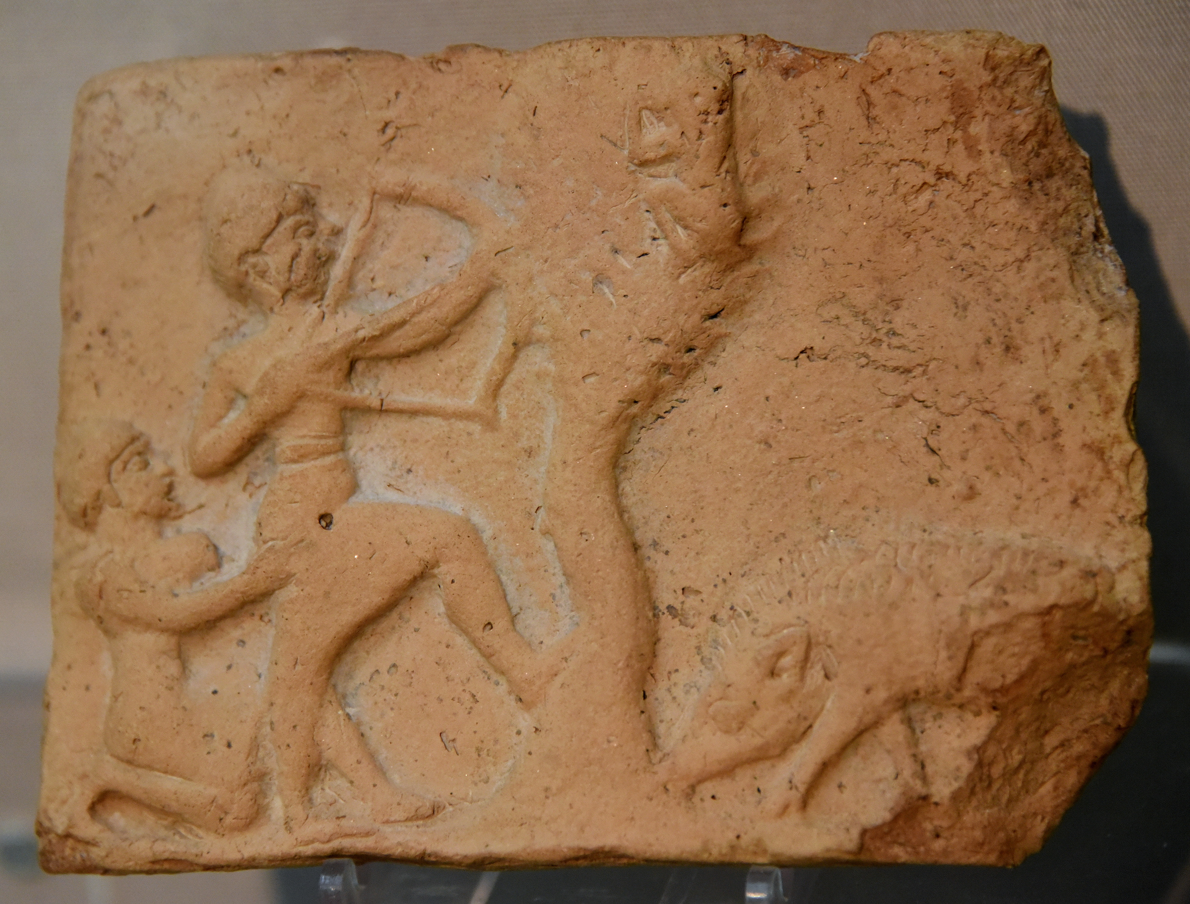Clay plaque showing a man shooting at a monkey. The monkey is in the branches of a tree, in the centre. There is a boar at the foot of the right side of the tree. A kneeling man assists the shooter. This is possibly a scene from an Indian story. Old Babylonian Period, 2000-1600 BCE. From Southern Mesopotamia, modern-day Iraq. Acquired with the assistance of the Art Fund. (The British Museum, London).