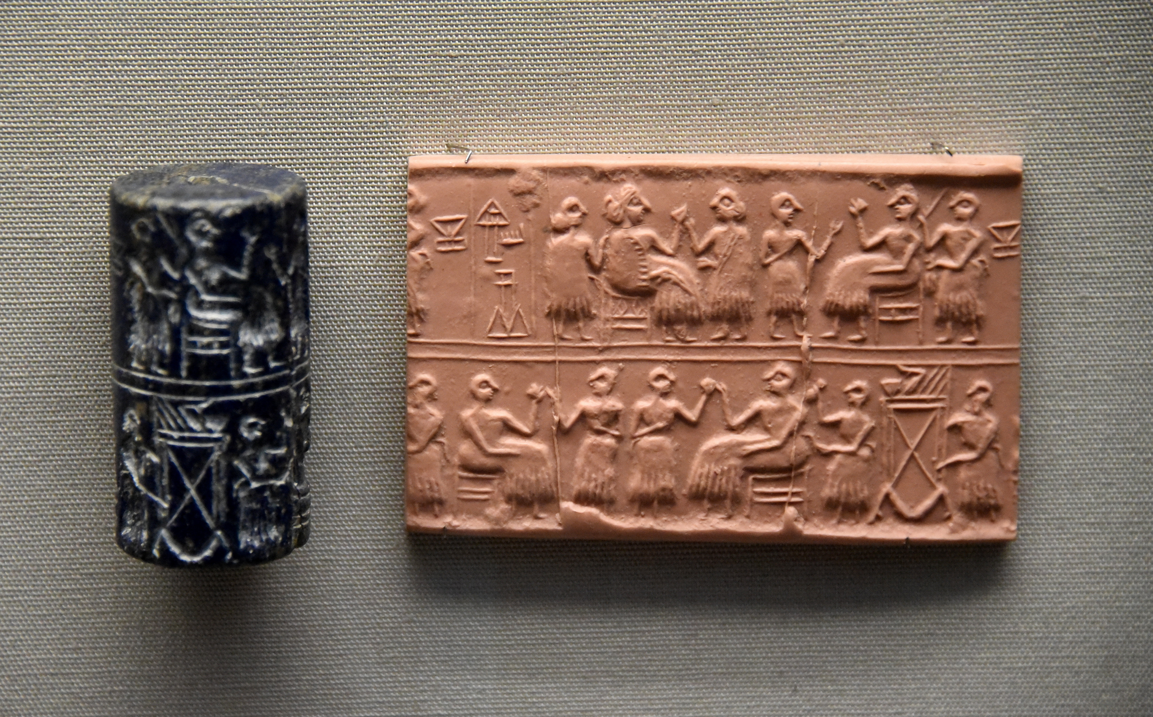 This seal was found by Puabi's right arm inside her grave. The seal depicts a banquet/feast scene, in two horizontal registers; one of the typical themes of the Early Dynastic III seals. The upper register depicts a seated female figure, which might Puabi herself. Early Dynastic Period, circa 2600 BCE. From the Royal Cemetery at Ur, Southern Mesopotamia, modern-day Iraq. Part of objects allotted to the British Museum from Ur excavation season 1927-1928 CE.(The British Museum, London).