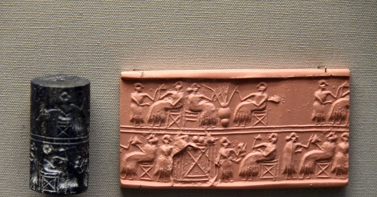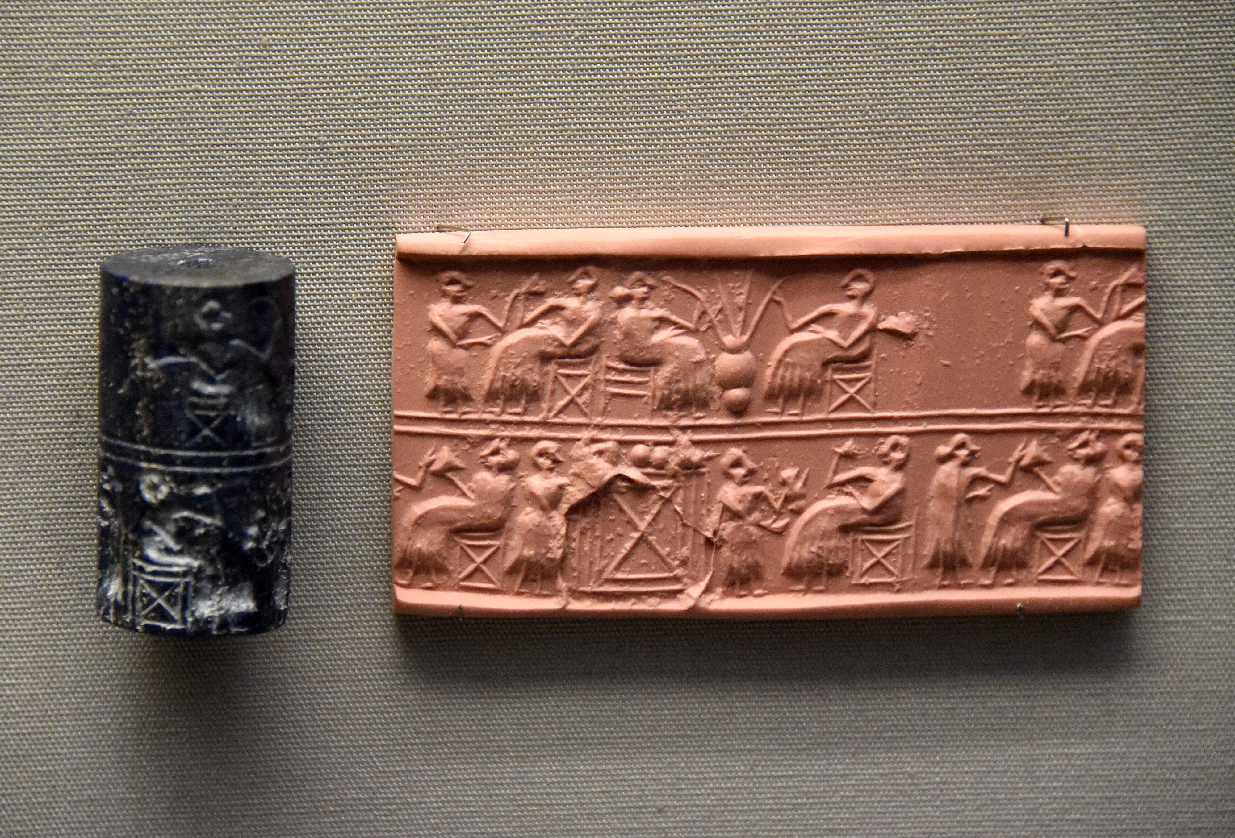 This seal was found by Puabi's right arm inside her grave. The seal depicts a banquet/feast scene, in two horizontal registers; one of the typical themes of the Early Dynastic III seals. Each register depicts a man and a woman (probably Puabi) drinking from straw-like tubes (above register, probably beer) and goblets (lower register, possibly wine). Early Dynastic Period, circa 2600 BCE. From the Royal Cemetery at Ur, Southern Mesopotamia, modern-day Iraq. Part of objects allotted to the British Museum from Ur excavation season 1927-1928 CE.(The British Museum, London).