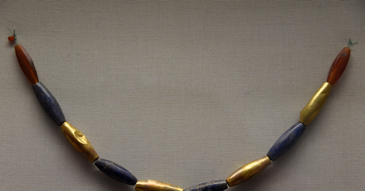 This is a group of barrel-shaped beads of bitumen overlaid with four gold, four lapis lazuli, and two faceted cornelian beads. This jewellery was found by Puabi's thighs inside her grave, which might possibly have formed part of her belt. Puabi was a Semitic Akkadian woman from Ur, c. 2600 BCE, possibly a queen or priestess. Early Dynastic Period, circa 2600 BCE. From the Royal Cemetery at Ur, Southern Mesopotamia, modern-day Iraq. Part of objects allotted to the British Museum from Ur excavation season 1927-1928 CE. (The British Museum, London).