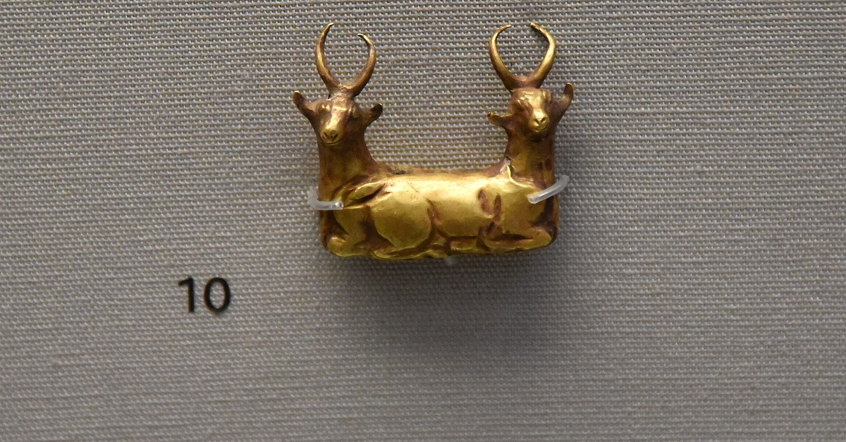 The antelopes of this amulet were joined at their hindquarters. This gold jewellery was found (together with fish amulets) on Puabi's arm inside her grave. Early Dynastic Period, circa 2600 BCE. From the Royal Cemetery at Ur, Southern Mesopotamia, modern-day Iraq. Part of objects allotted to the British Museum from Ur excavation season 1927-1928 CE.(The British Museum, London).