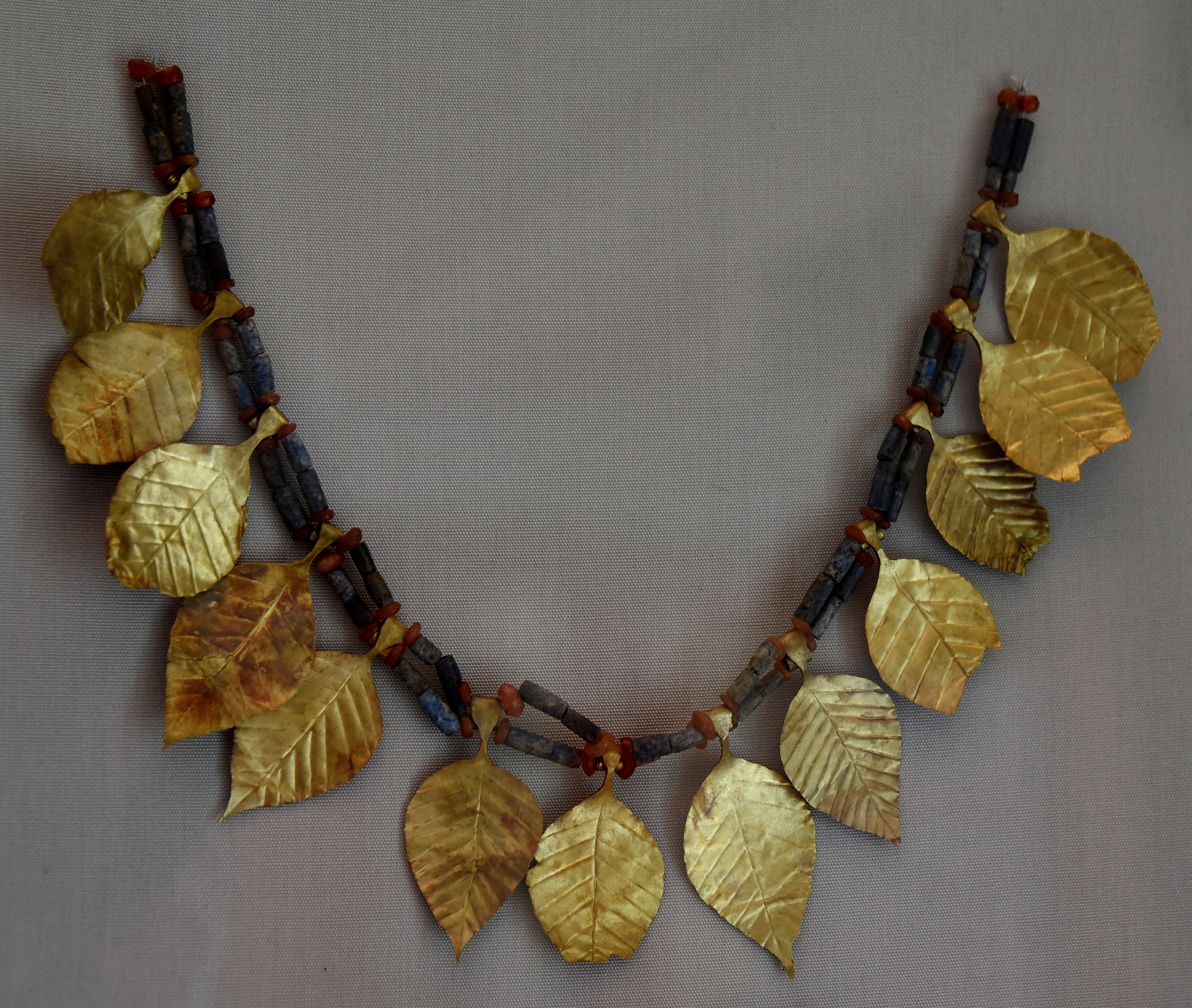 This woman's headdress is composed of a double row of carnelian and lapis lazuli beads. Thirteen gold leaf-shaped pendants are attached to the beads. The leaves appear to be polar leaves or leaves of the sissoo, or Indian rosewood tree. This jewellery was part of a headdress worn by one of Queen Puabi's attendants and was found inside Puabi's grave. Early Dynastic Period, circa 2600 BCE. From the Royal Cemetery at Ur, Southern Mesopotamia, modern-day Iraq. Part of objects allotted to the British Museum from Ur excavation season 1927-1928 CE. (The British Museum, London).