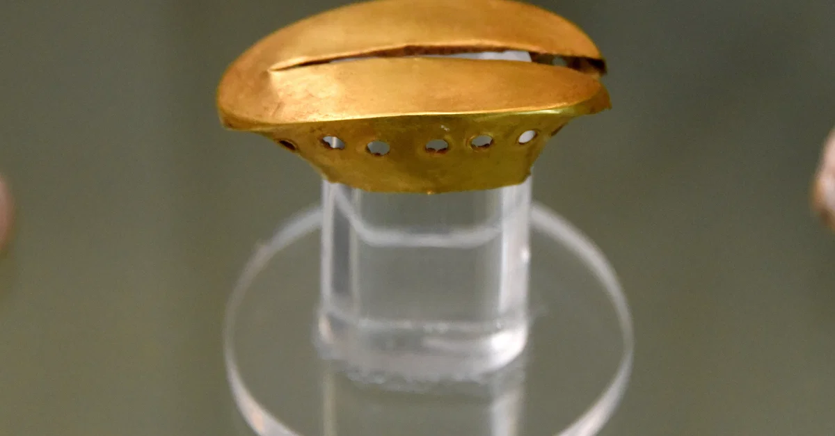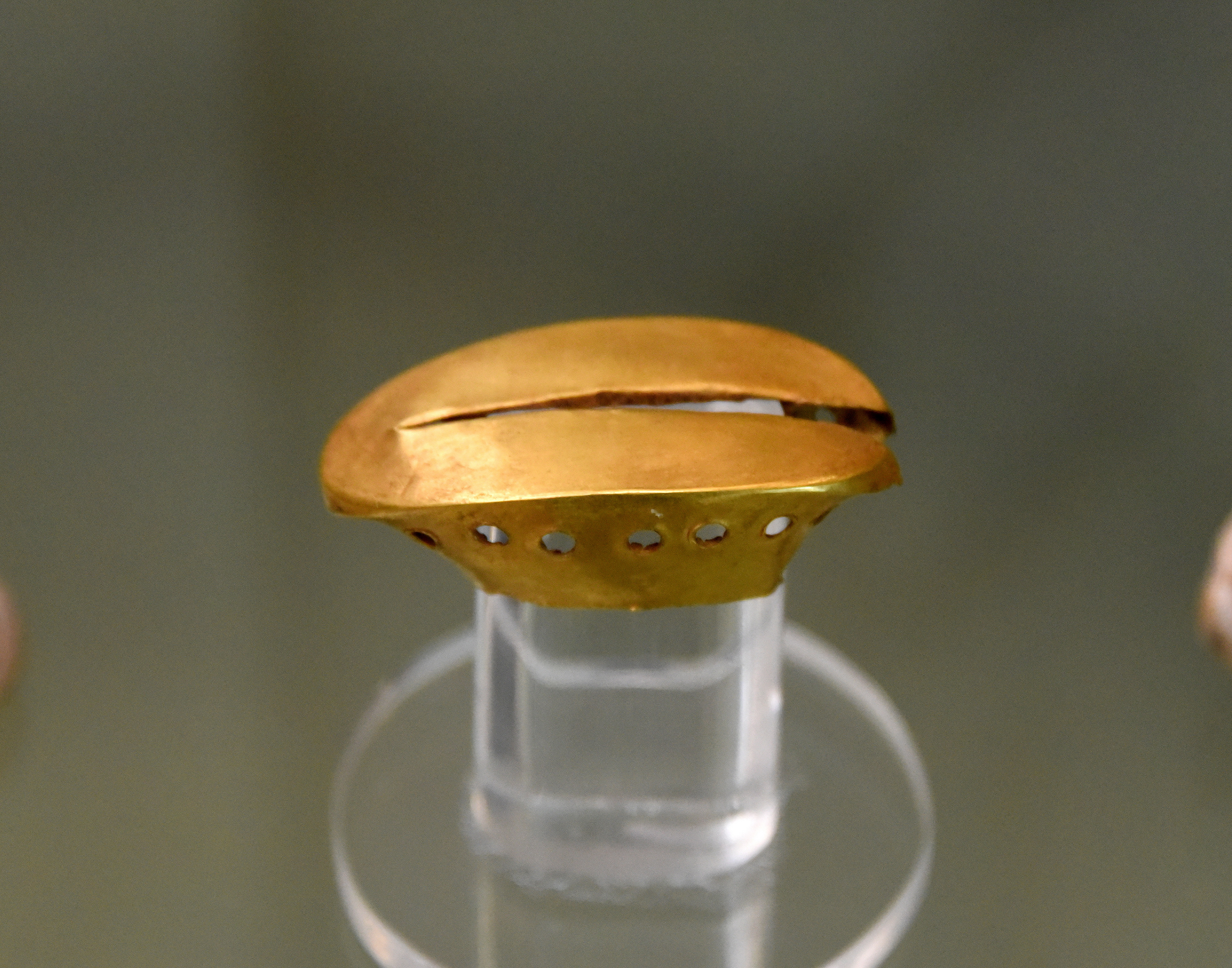 This is a gold pommel from the hilt of a dagger. Many rivet holes can be seen. Early Dynastic Period, circa 2600 BCE. From the Royal Cemetery at Ur, Southern Mesopotamia, modern-day Iraq. Part of objects allotted to the British Museum from Ur excavation season 1927-1928 CE. (The British Museum, London).