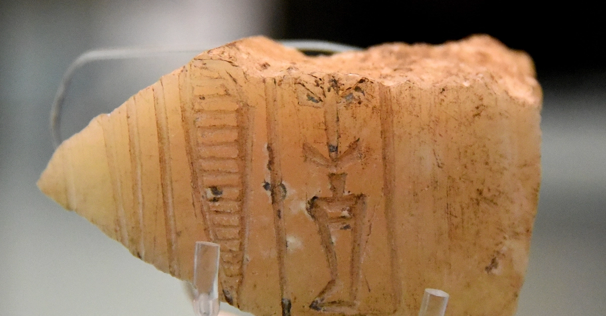 This small fragment came from a large upright stone jar. The jar was inscribed with the name of the Akkadian king Rimush, son of Sargon. Akkadian Period, reign of Rimush, 2278-2270 BCE. From Ur, Southern Mesopotamia, modern-day Iraq. (The British Museum, London).