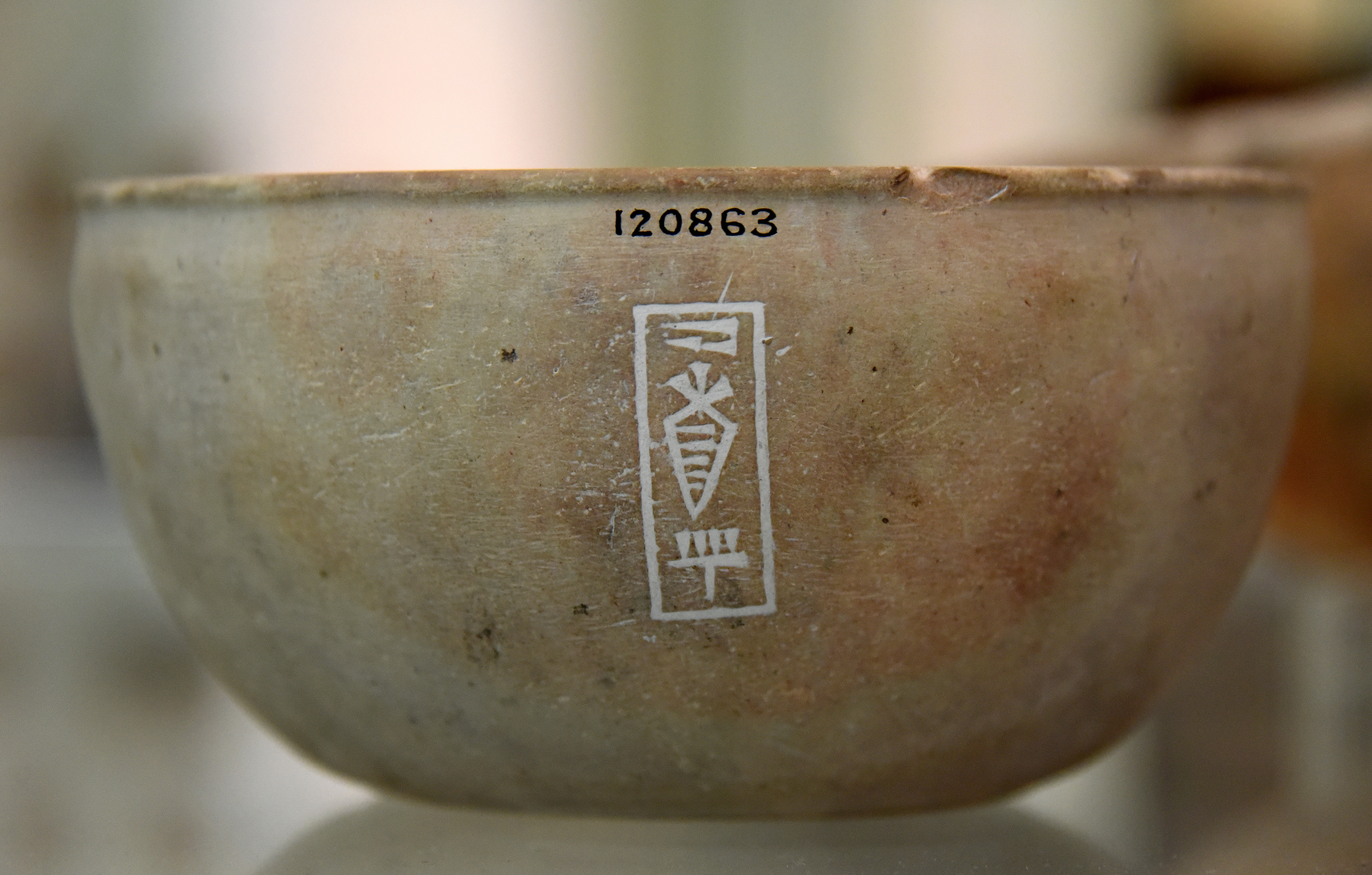 Agirgal was probably the name of the owner of the bowl. It was found in grave PG33. Akkadian to Neo-Sumerian Period, 2300-2100 BCE. From the Royal Cemetery at Ur, Southern Mesopotamia, modern-day Iraq. Part of objects allotted to the British Museum from Ur excavation season 1926-1927 CE. (The British Museum, London).