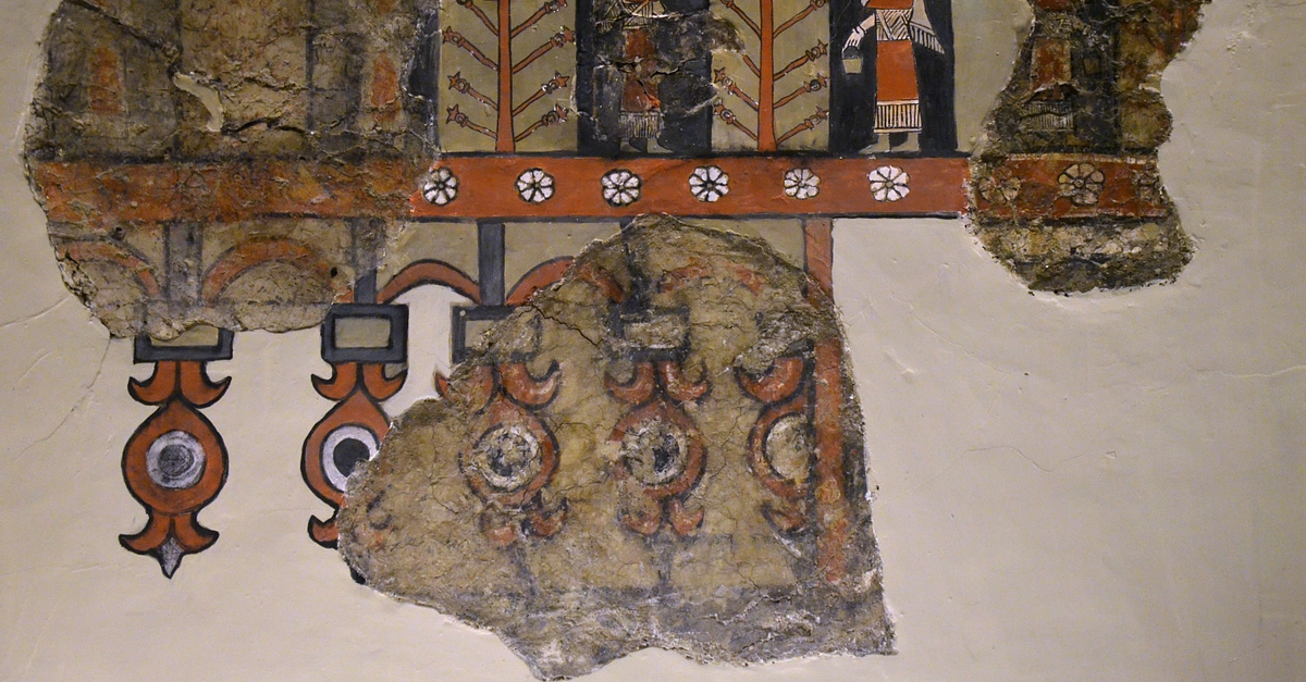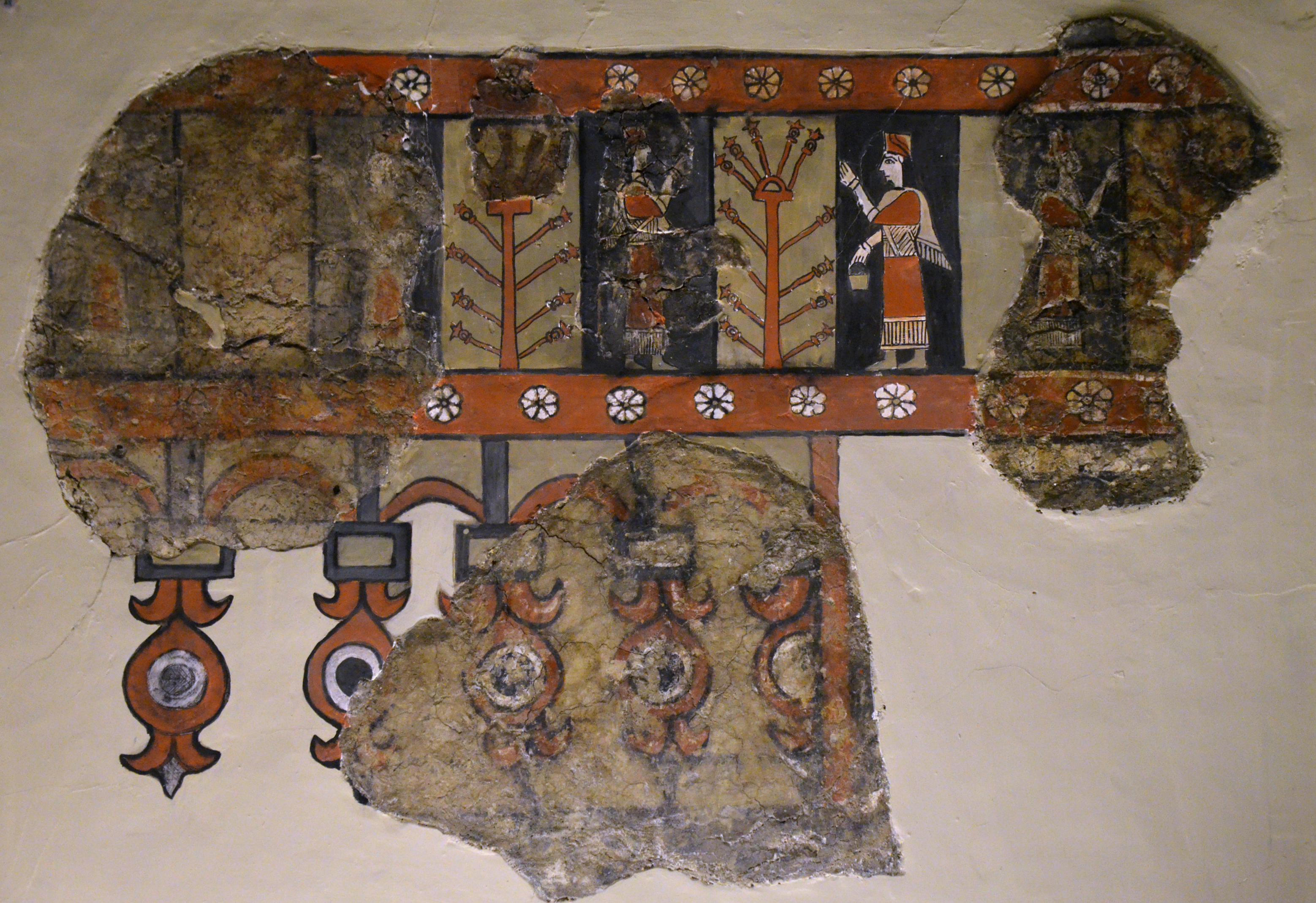 Mural painting uncovered in the Urartian temple at Altıntepe. The painting is made of clay and plaster and features winged demons standing on either side of a sacred tree with plants, flowers and geometric motifs. 8th - 6th century BCE. (Museum of Anatolian Civilizations, Ankara)