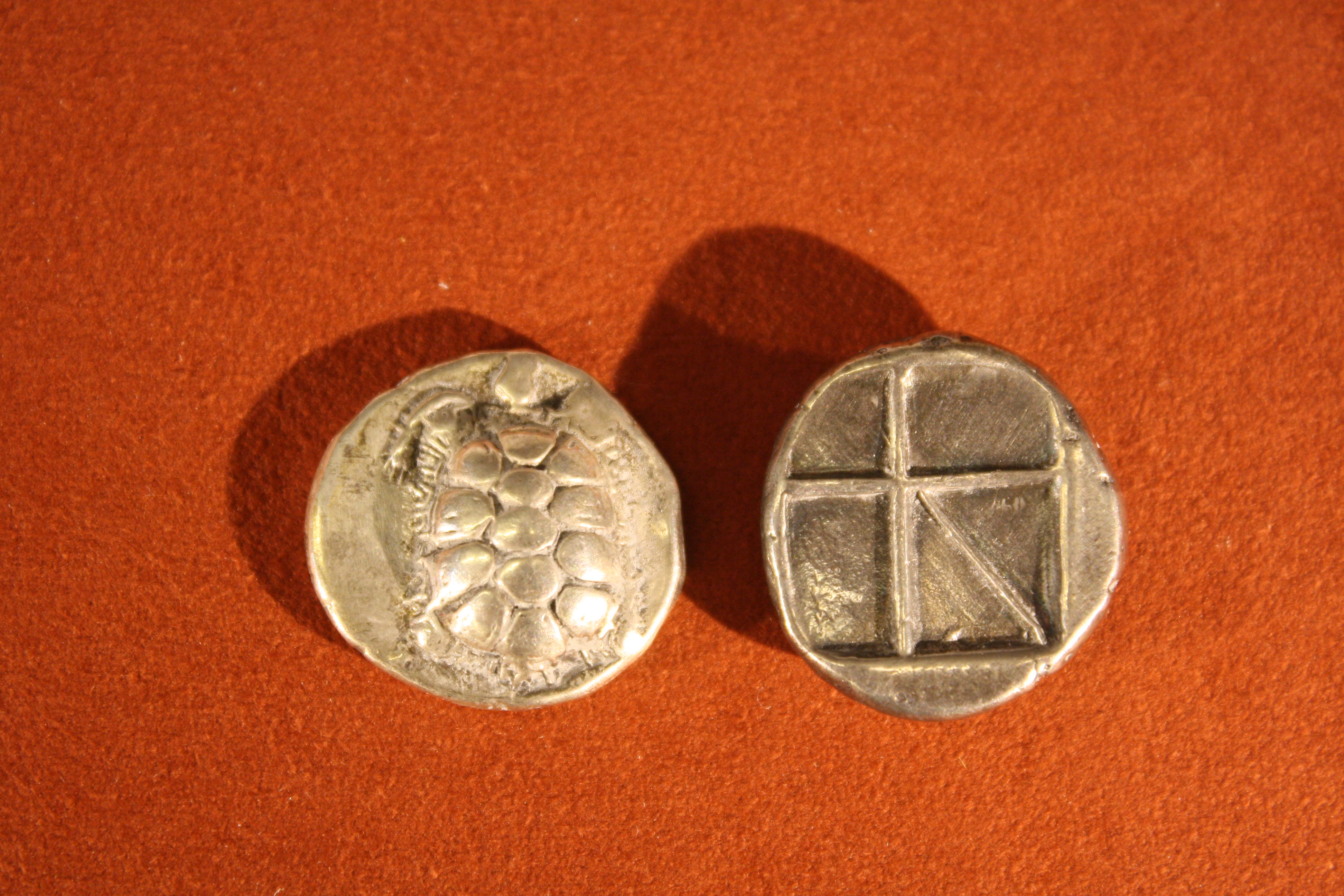 Silver stater from Aegina, 4th century BCE. O: turtle. R: Incuse square with five sections.