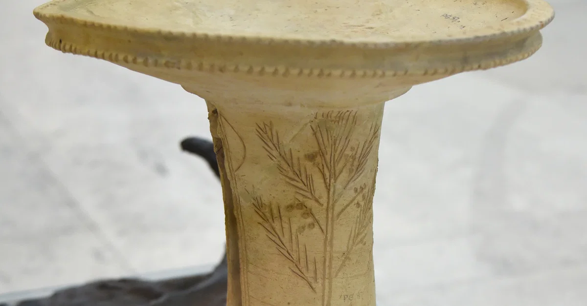 This offering stand has a hollow trunk with two long vertical slots at the sides. There is an incised decoration around the stem, typical of Sumerian art; plants indicative of fertility and doorposts found on temple facades and in religious scenes. From the Royal Cemetery at Ur, grave PG 87, Southern Mesopotamia, modern-day Iraq. Early Dynastic Period, 2600-2400 BCE. Part of objects allotted to the British Museum from Ur excavation season 1927-1928 CE. (The British Museum, London).