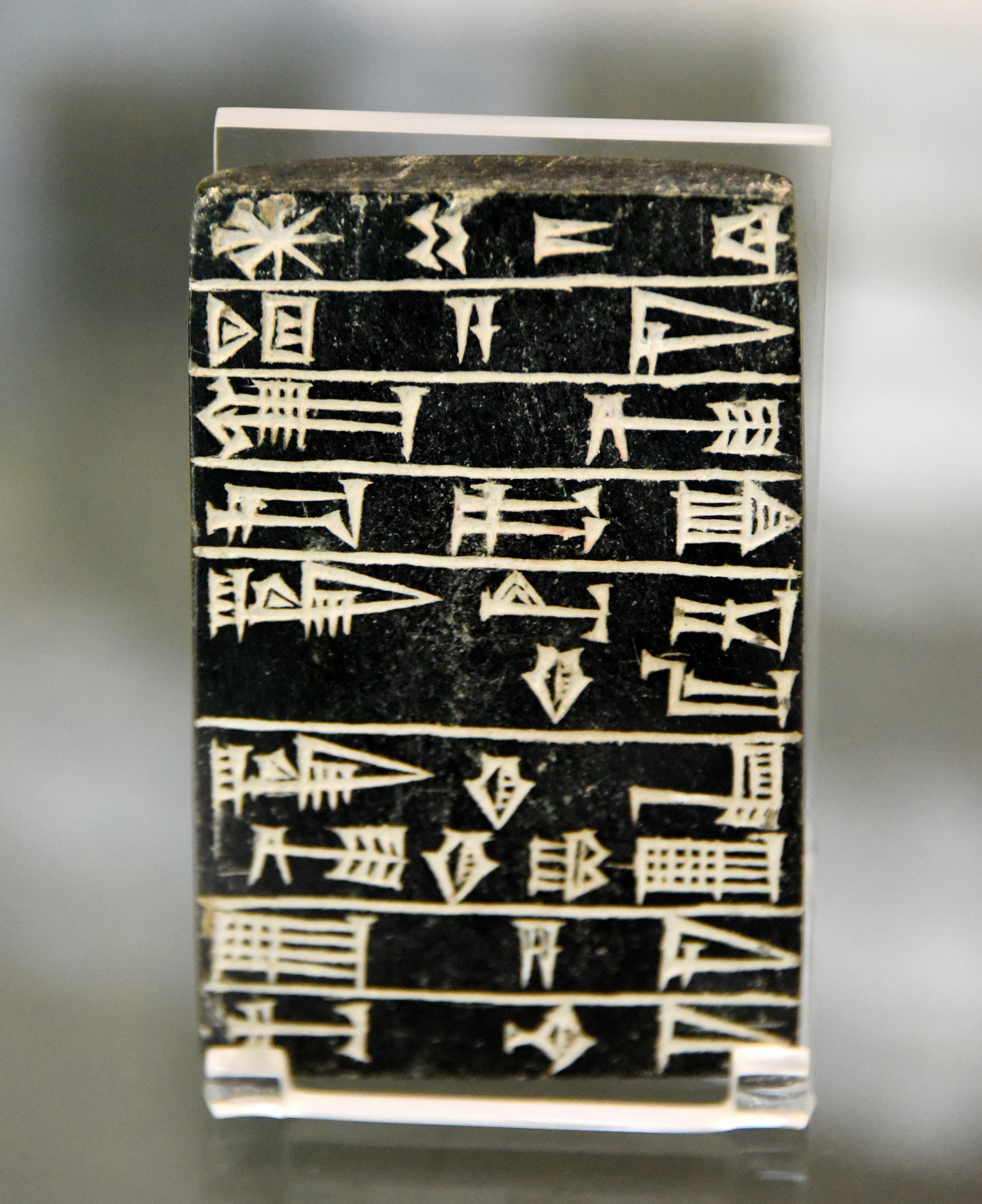 This is a black steatite stone tablet, inscribed with a cuneiform text. This was a dedication to the Temple of Dimtabba (Nimintaba) at Ur by Shulgi. Shulgi was king of Ur III dynasty. It was found buried with a copper alloy foundation figurine of the same king. From Southern Mesopotamia, modern-day Iraq. Neo-Sumerian Period, reign of Shulgi, 2094-2047 BCE. (The British Museum, London).