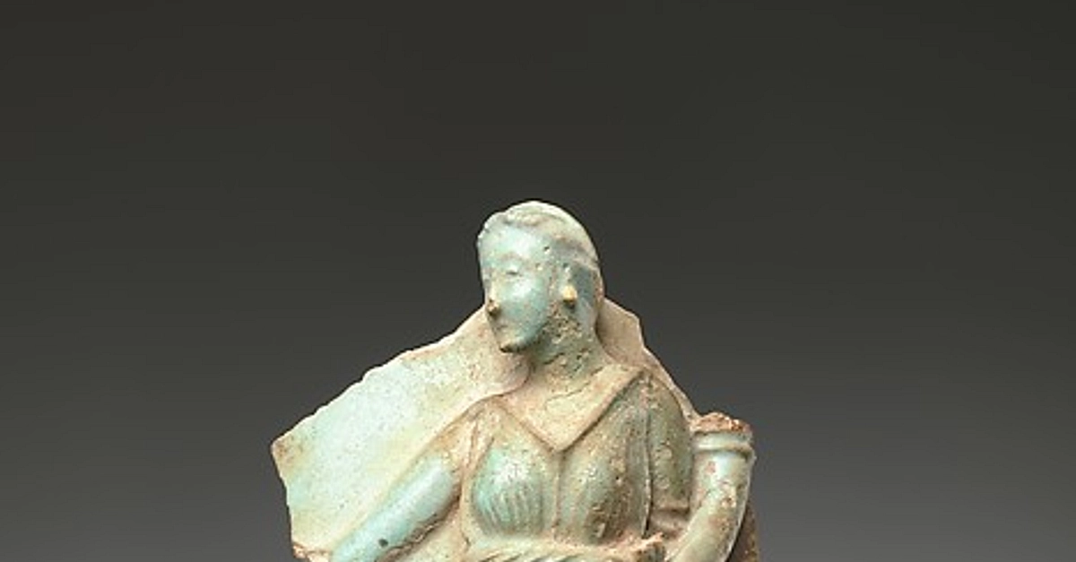 This fragment came from a wine jug (referred to as "oinochoai") that was used for pouring libations during festivals of the Ptolemaic dynastic cult. This particular jug was crafted around 246-221 BCE. Berenike II is portrayed on this fragment with the knotted robe of Isis and the cornucopia of Aphrodite, reinforcing her connection to the Hellenized Egyptian goddess of fertility and prosperity. Found near Alexandria, Egypt. (Metropolitan Museum of Art, New York)