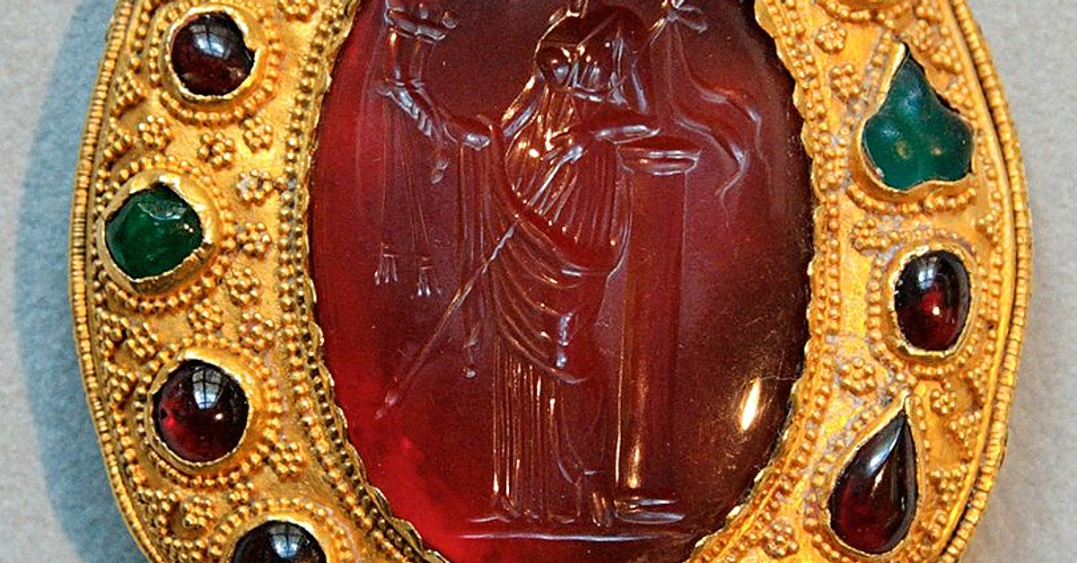 Gem intaglio mounted on gold and framed by glass, emeralds and garnets. The draped and sceptred figure is thought to be a Ptolemaic queen. In her right arm, she bears the cornucopia of Aphrodite or Isis-Aphrodite. Egyptian, 1st century BCE.
