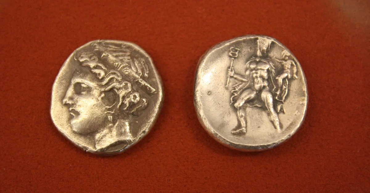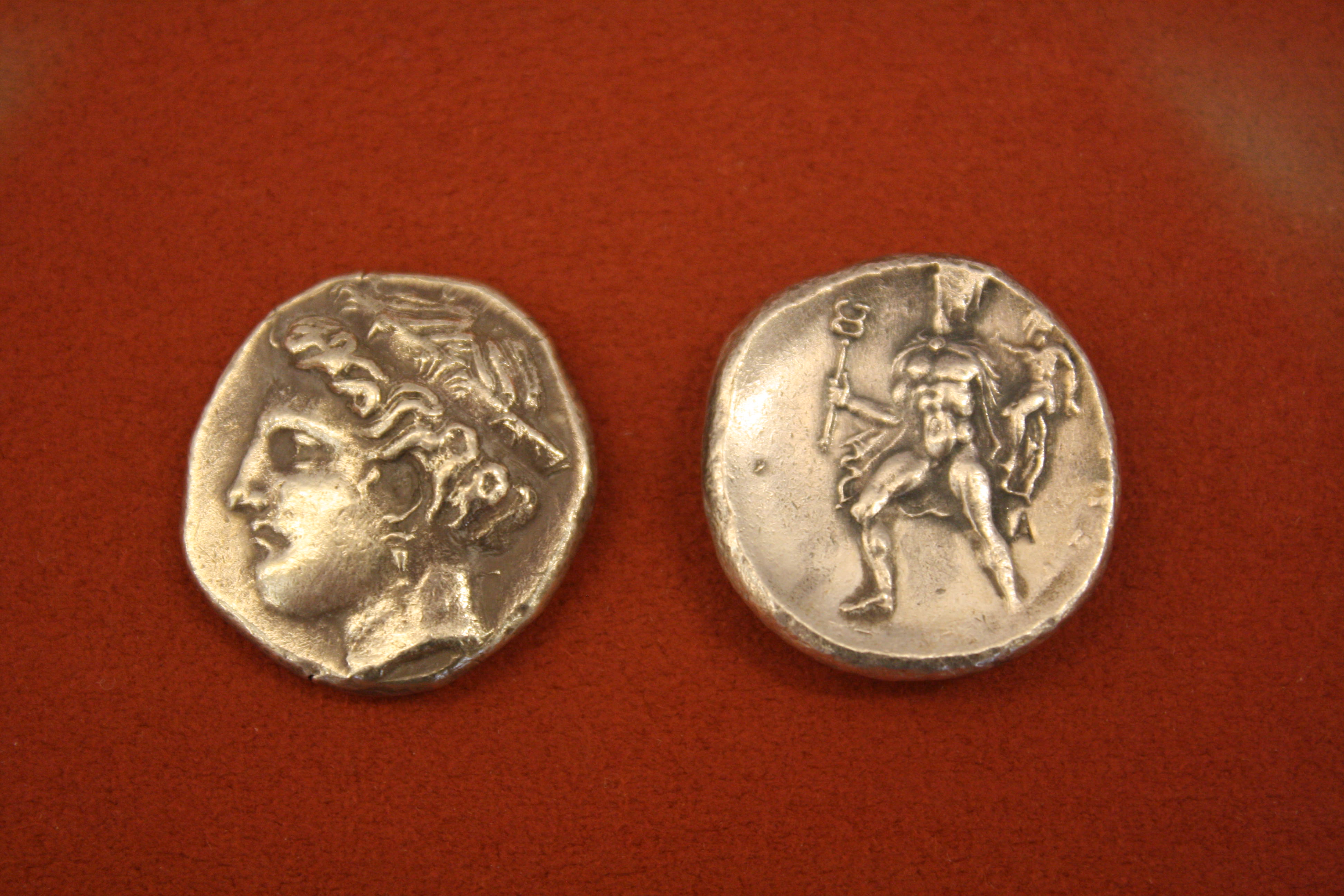 Silver stater from Pheneos, Arcadia, c. 350 BCE. O: Head of Demeter. R: Hermes with caduceus and the infant Arcas.