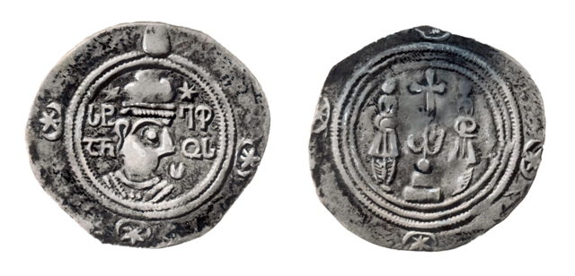 Kartli/Iberia coin of Prince Stephanos I, second emission. Silver. The weights range from 2,03 gr. to 3,02 gr. d = 25/26-28 mm. Obverse: shah/ruler to the right. Instead of Pehlevi, Georgian inscription (Asomtavruli) – ႱႲႤႴ/ႠႬႭႱ (Stephanos) to the left and right. Twofold circle around it. Reverse: Cross on altar, protected by two guardians. No Pehlevi inscription. Threefold circle around it. Mint: Unknown. Nominal: Drachm. 2,03 gr.-3,02 gr. Date: 595-600/602 or 592 (?).