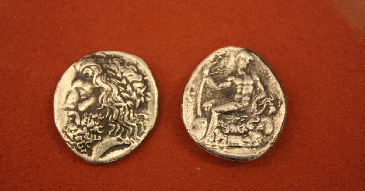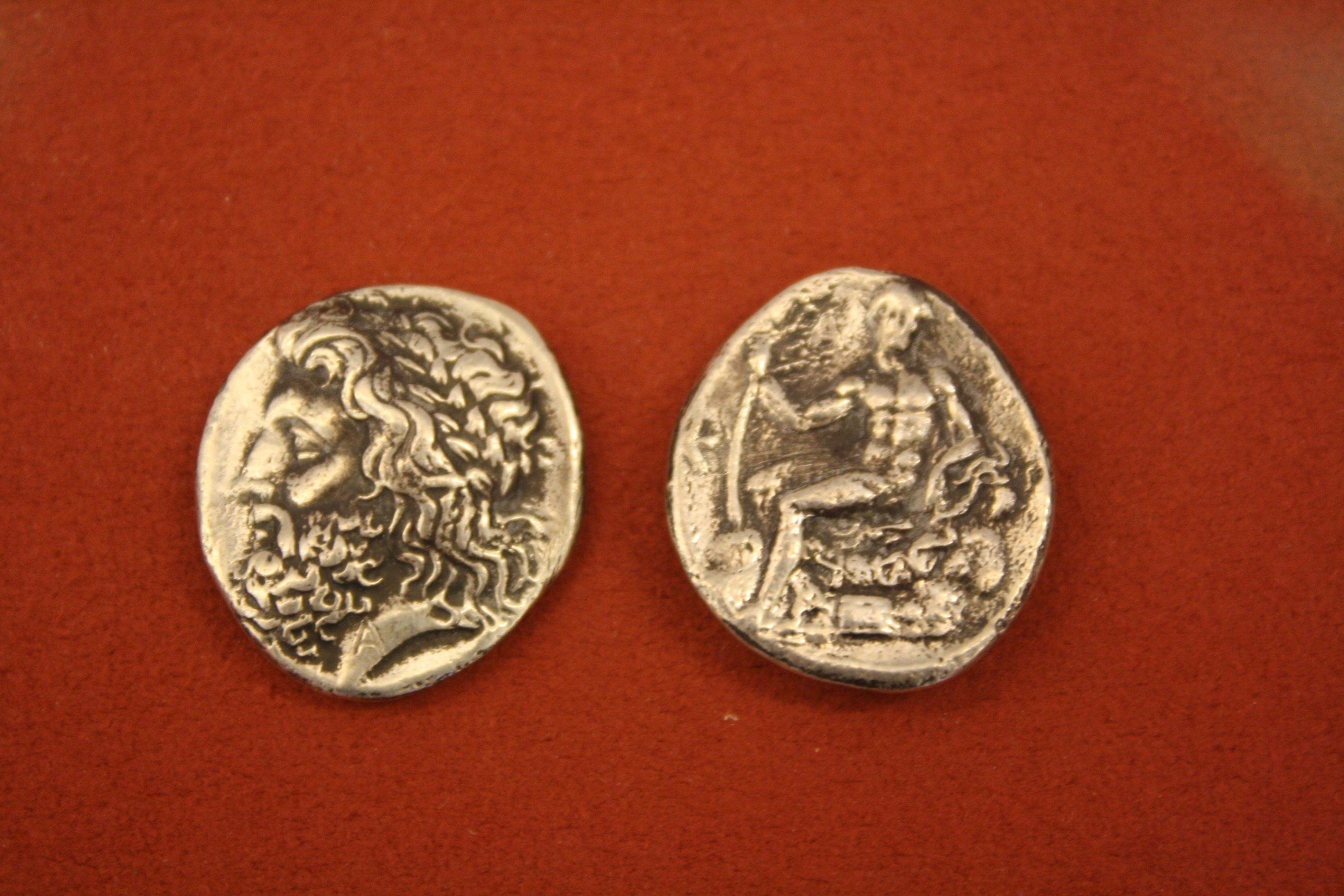 Silver stater of the Archadian League, c. 360 BCE. O: Head of Zeus Lykaios. R: Seated Pan.
