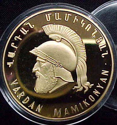 A modern medal depicting the Armenian general and leader of the Mamikonian dynasty Vardan Mamikonian who famously fell at the battle of Avarayr against the Sasanian Empire in 451 CE.
