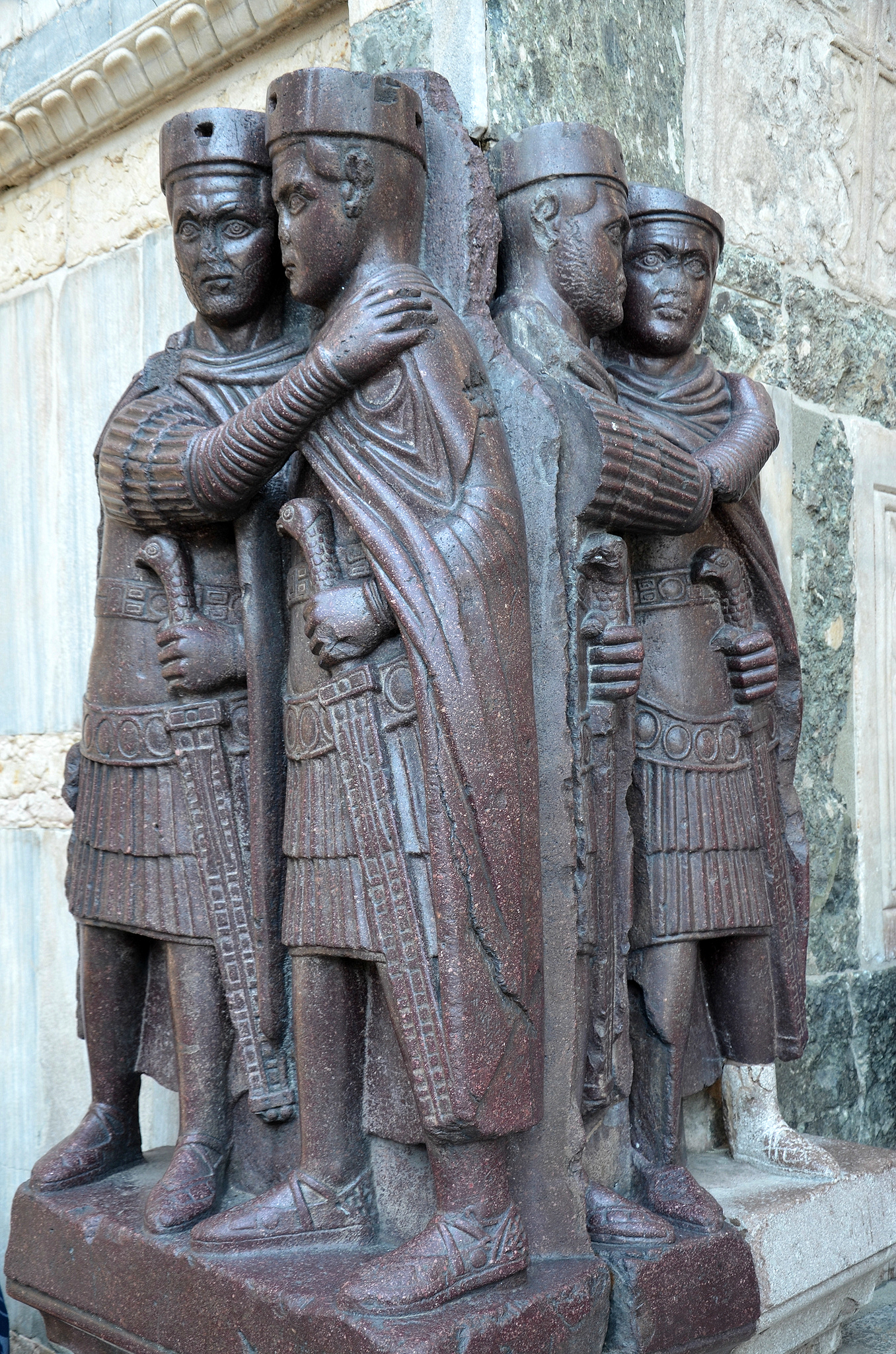 Porphyry sculpture portraying the four Tetrarchs (Diocletian, Maximianus, Galerius and Constantius Chlorus) embracing. It is dated to c. 300 CE and was sculpted in Asia Minor. It probably originally decorated two separate pillars in Constantinople but was plundered by the Venetians in 1204 CE. The sculpture has since been fixed to a corner of the facade of St. Mark’s Basilica in Venice, Italy.