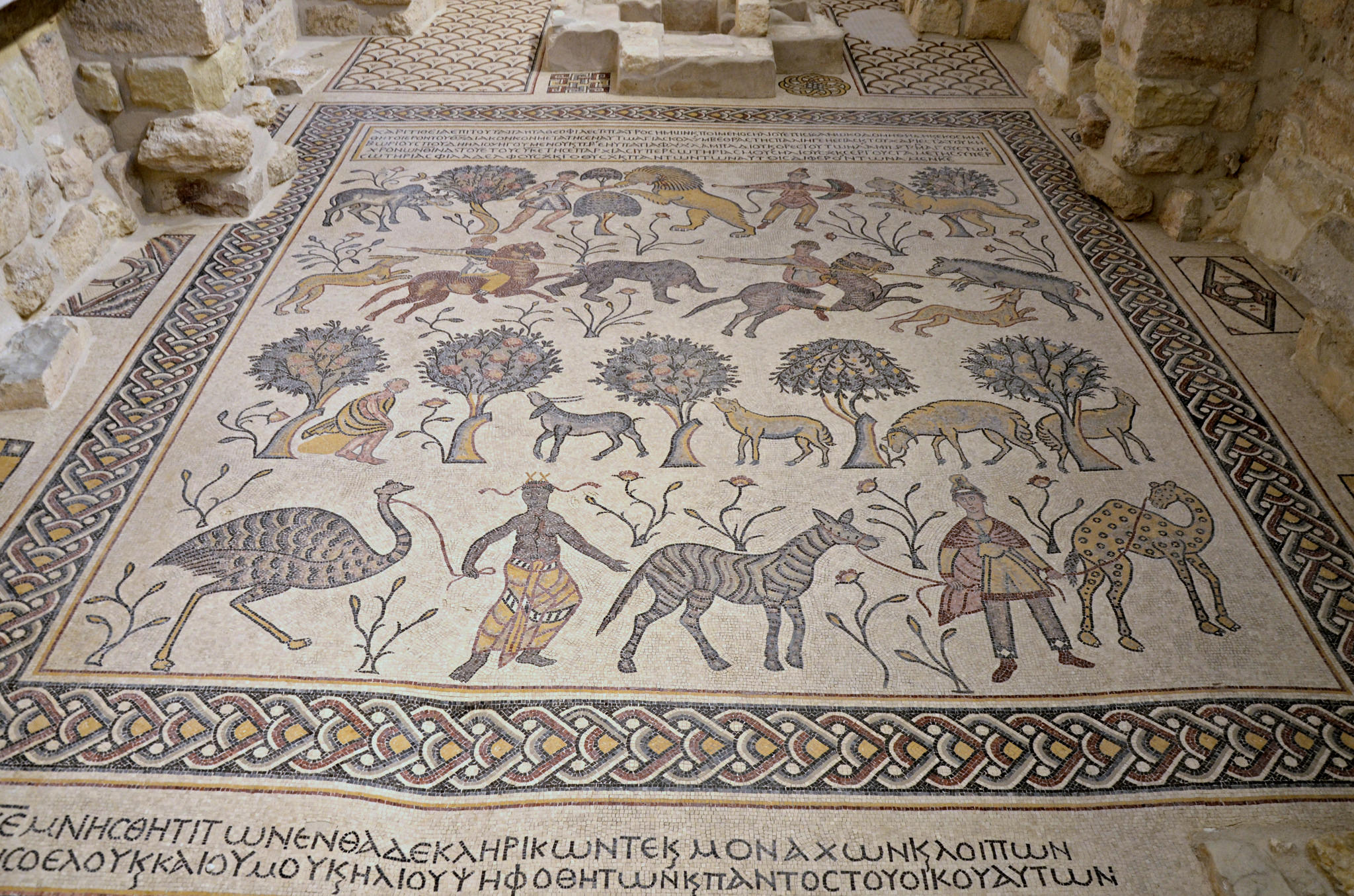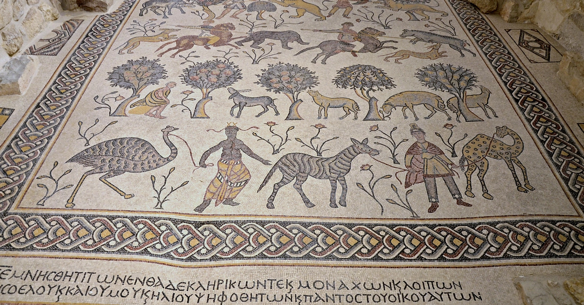6th century CE mosaic in the Diakonikon Baptistry of the Memorial Church of Moses in Mount Nebo, Jordan. The mosaic, dating to 530 CE, is a large square divided into two sections. The top section depicts hunting scenes while the lower section depicts pastoral scenes with a touch of the exotic.