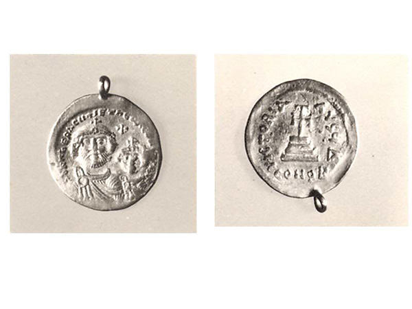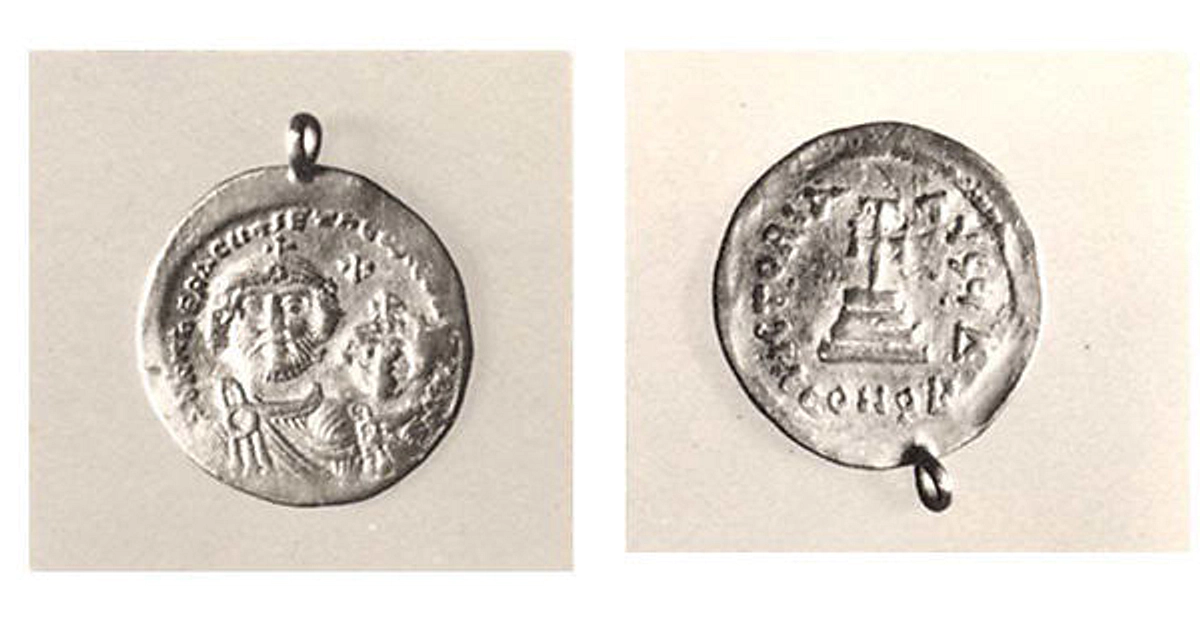 Solidus depicting Heraclius, who reigned from 610 CE to 641 CE. Discovered in Qasr-i Abu Nasr (Iran), it is made of gold and measures 1.9 cm. (Metropolitan Museum, New York)