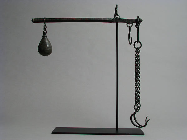 A Roman invention, the steelyard (or stilyard) balance employed sliding weights along an etched arm to determine the mass of goods, much like the modern beam balance. The Byzantine balance pictured dates from the 5th to 7th centuries CE. (Metropolitan Museum, New York)