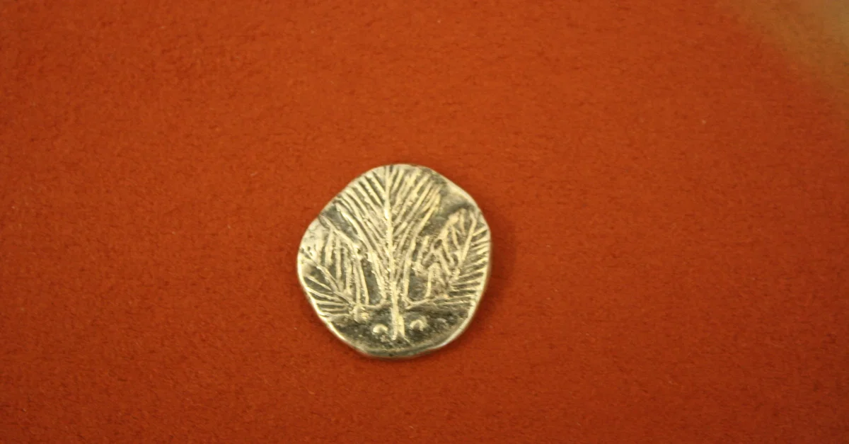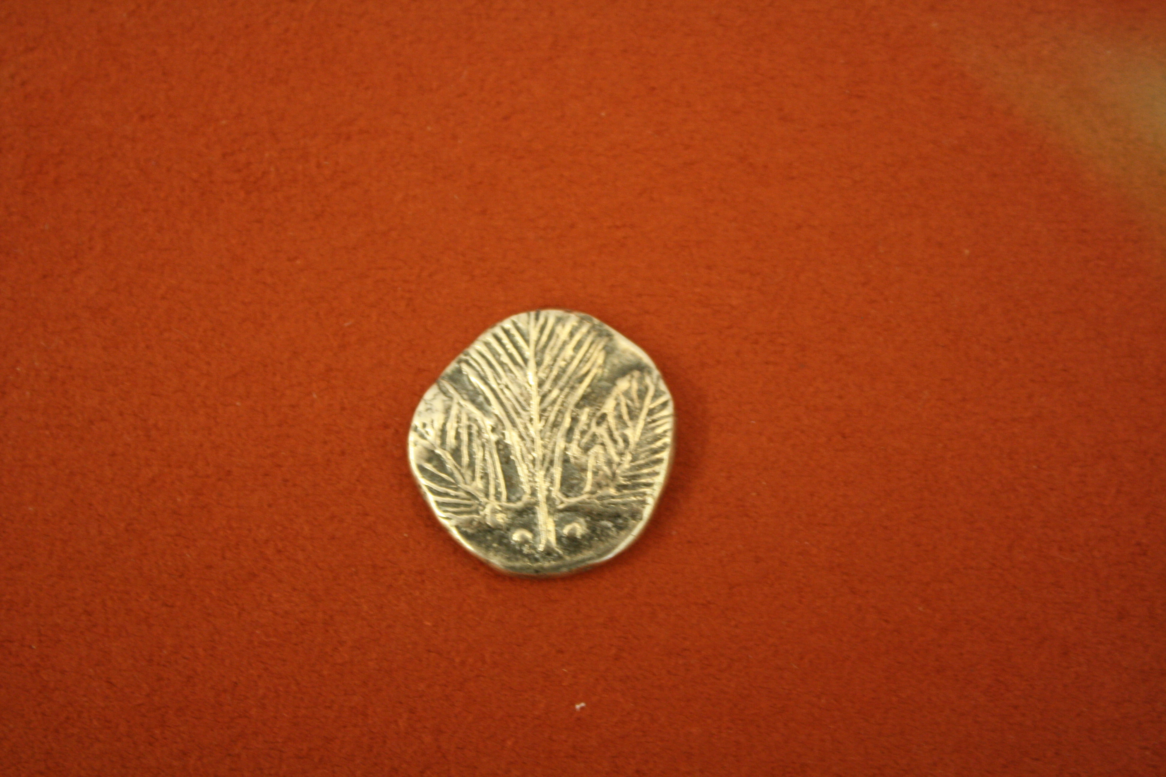 Silver didrachm from Selinus, Sicily, c. 530 BCE. O: Celery leaf. (R: incuse square with triangle sections).